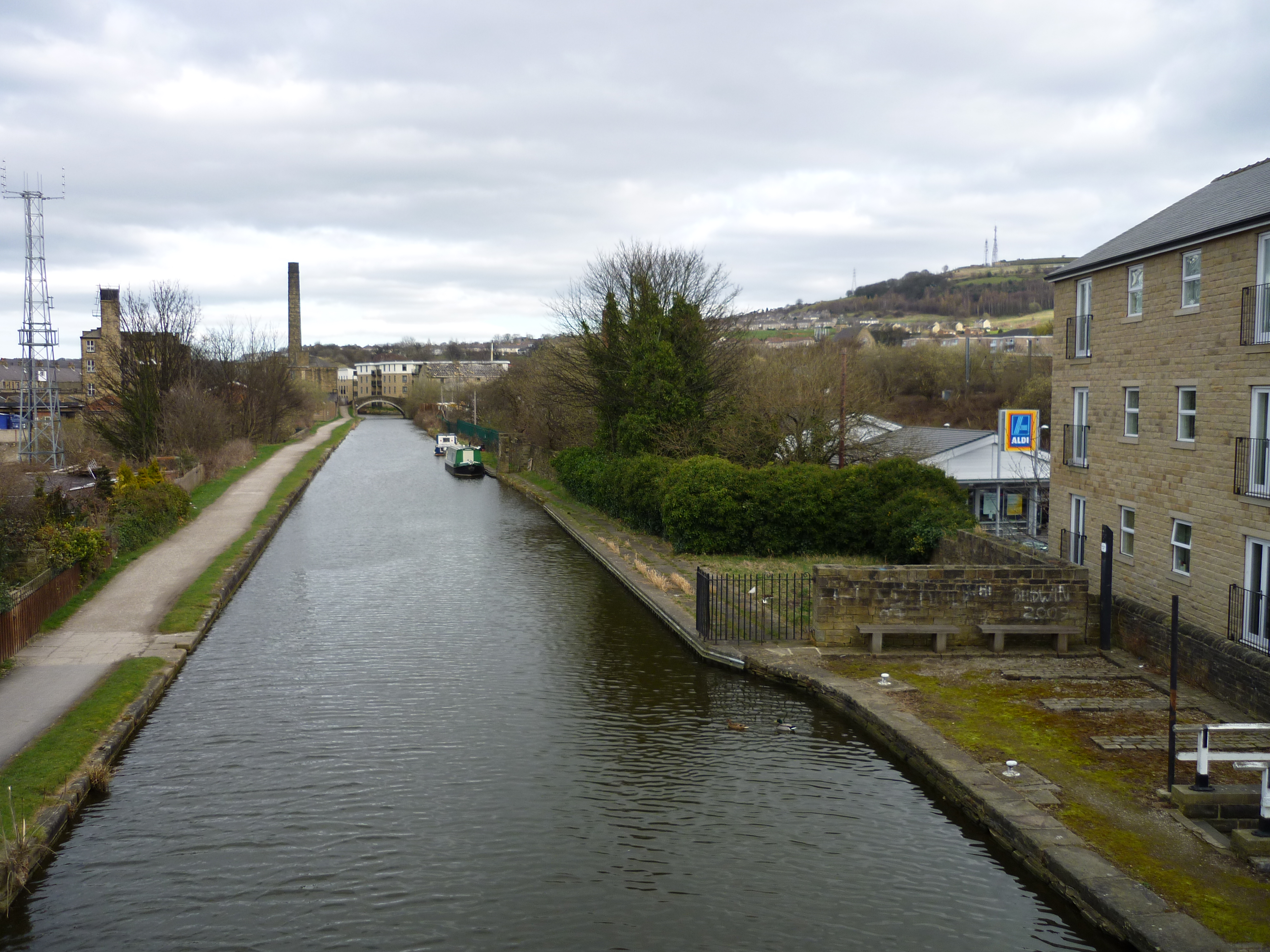 And let’s also not forget the Leeds-Liverpool canal, which (because it runs parallel with the Aire) literally has to cross over Bradford Beck… In the image below, we’re looking at the stretch of the canal that forms an aqueduct over the Beck. You wouldn’t guess it from this image – until you notice the Aldi in the bottom right corner, set well below the level of the canal… (Talk about “multi-storey water”!)