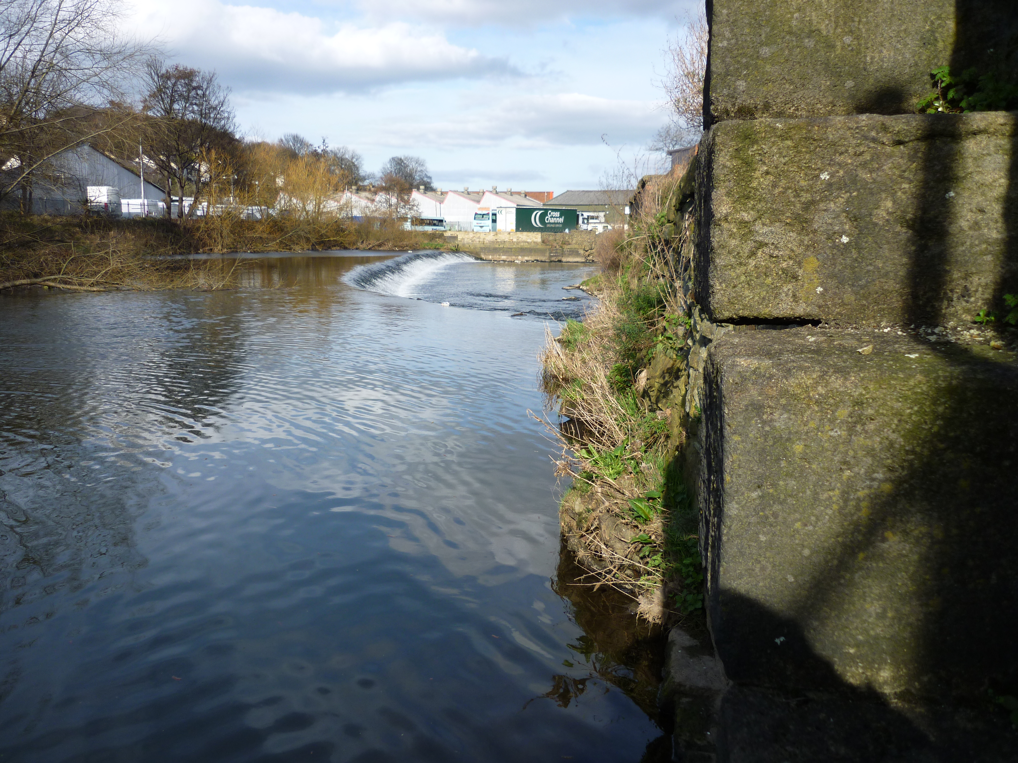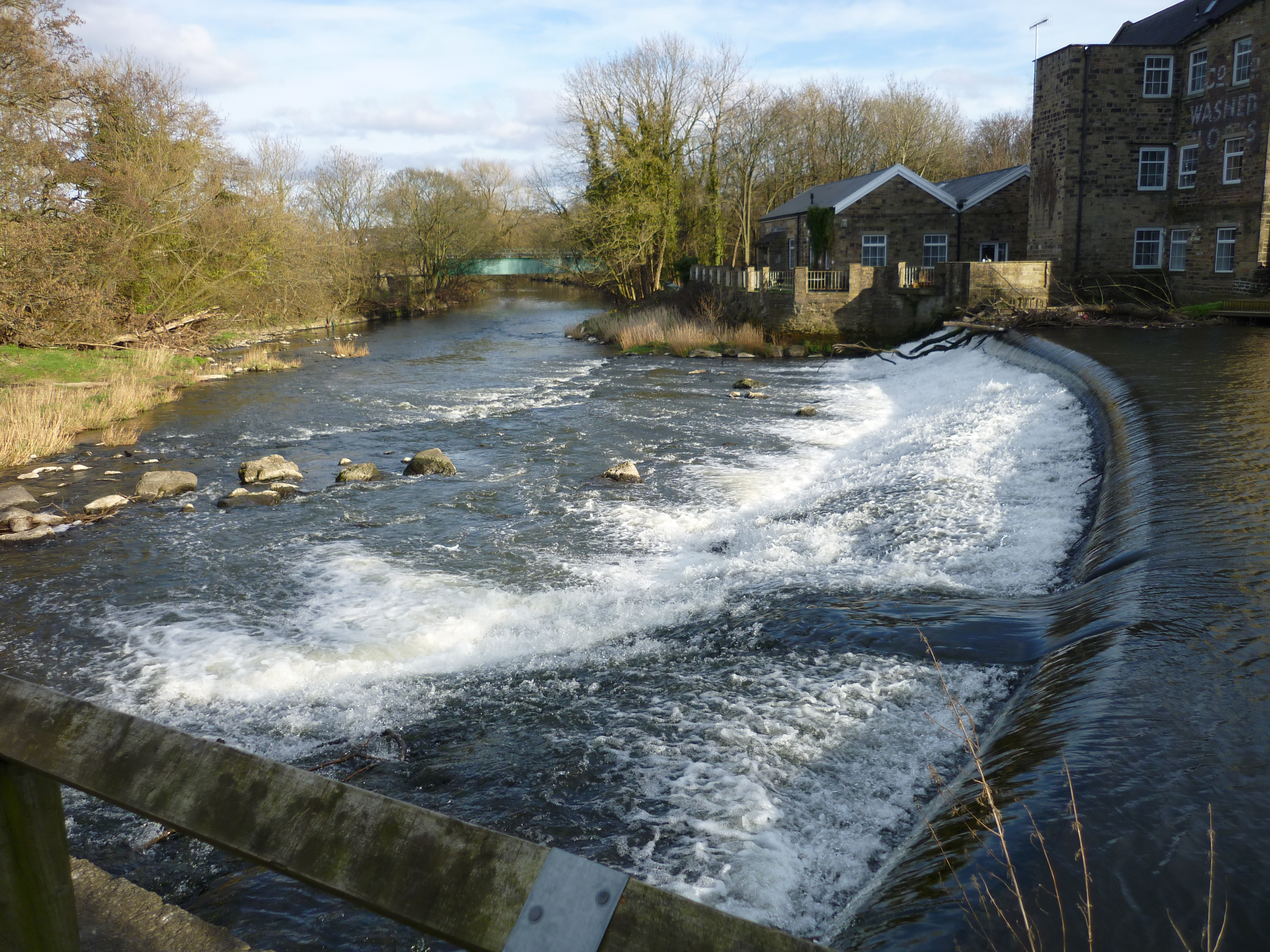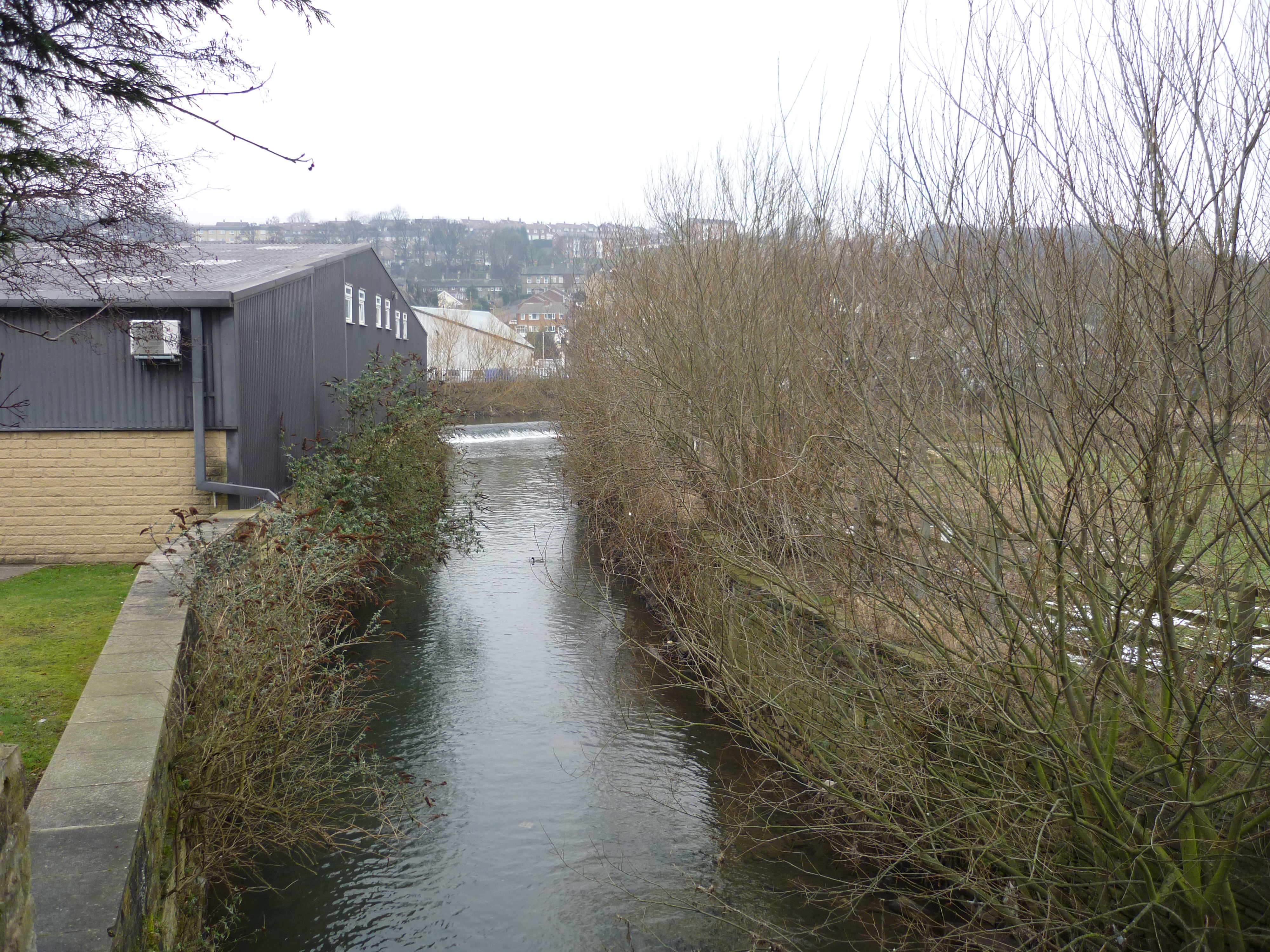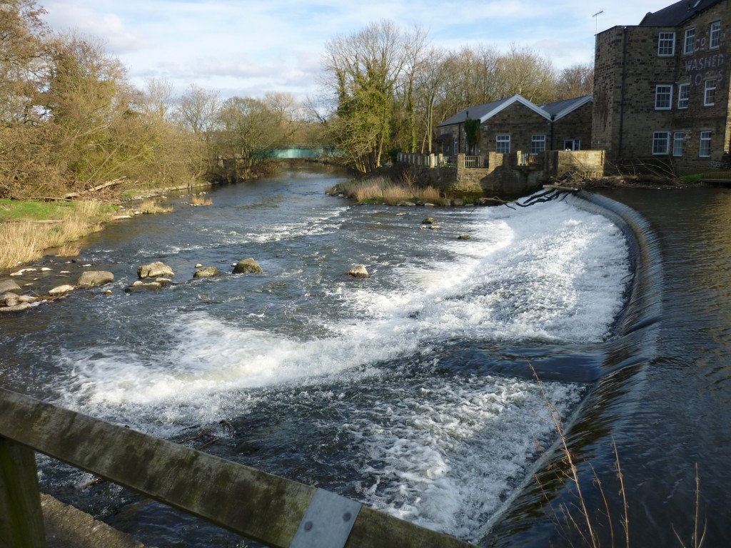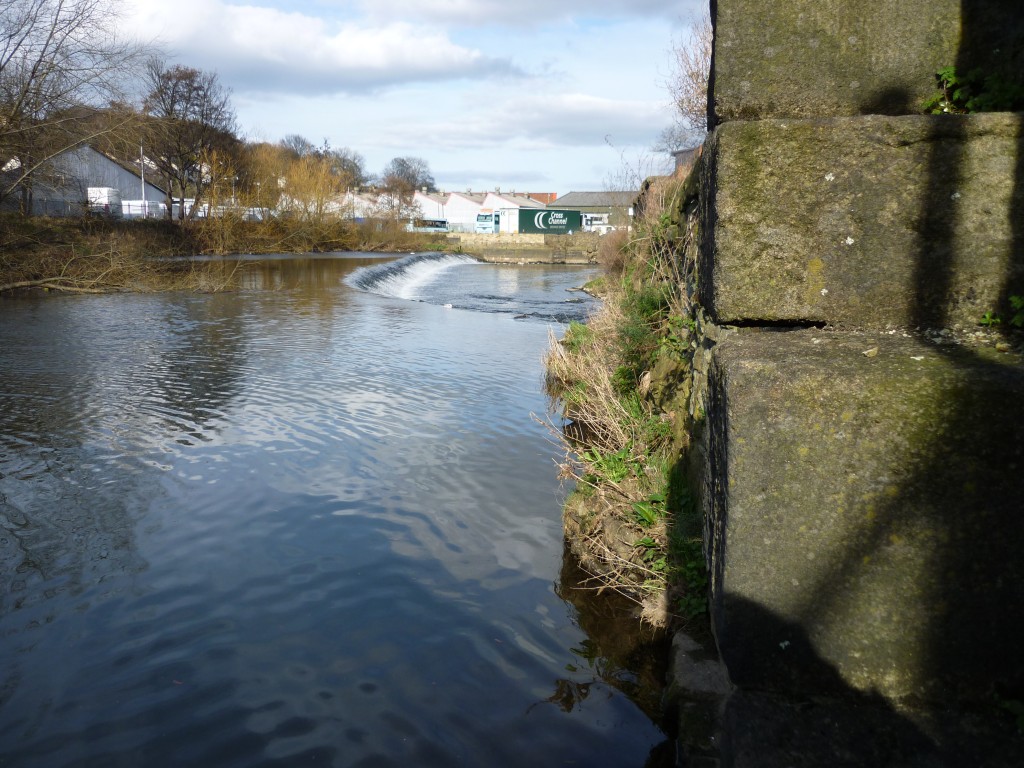 textFrom the same spot, looking downstream, we can see Shipley Weir – and some of the many industrial buildings in this heavily urbanised area…