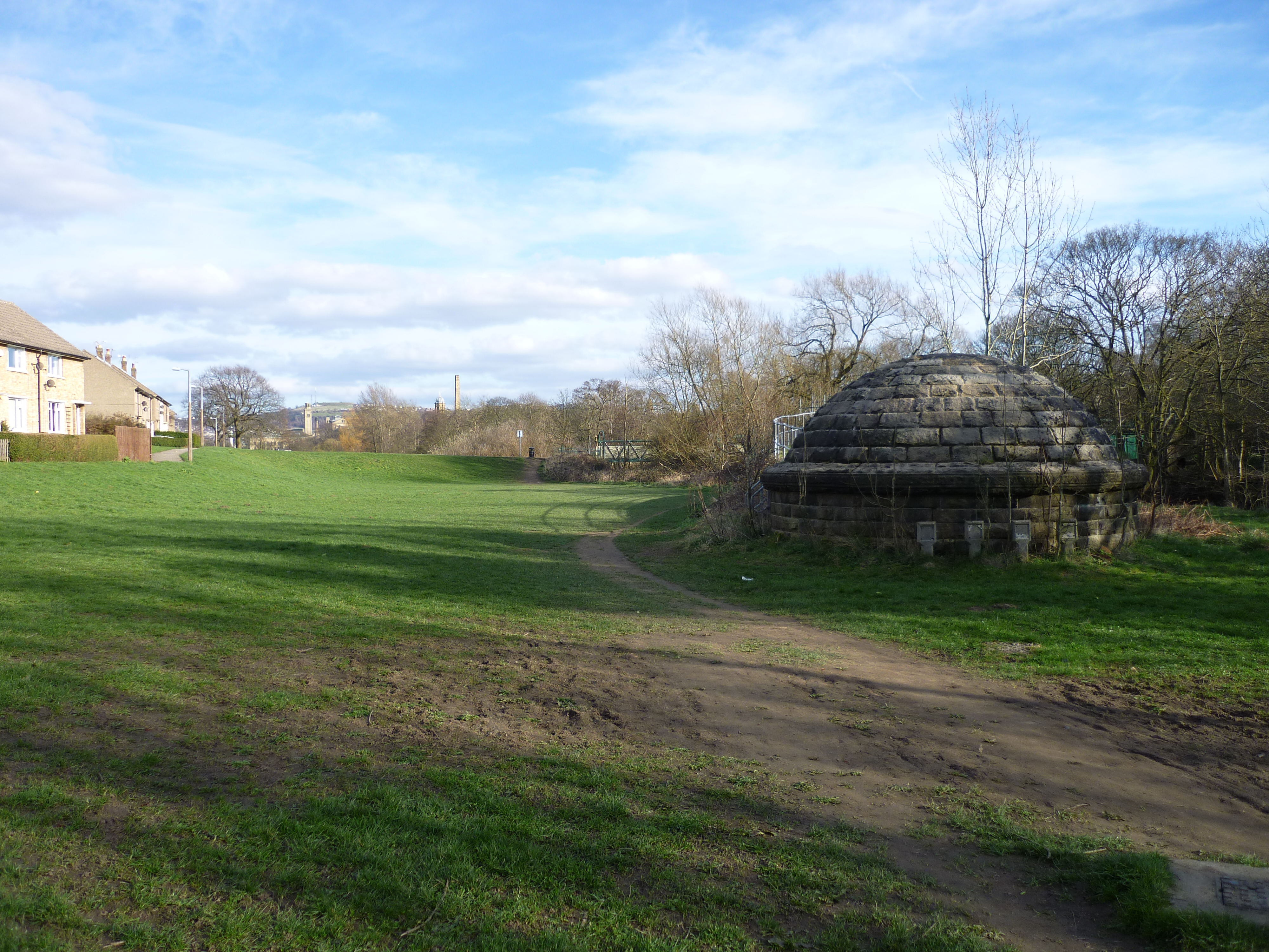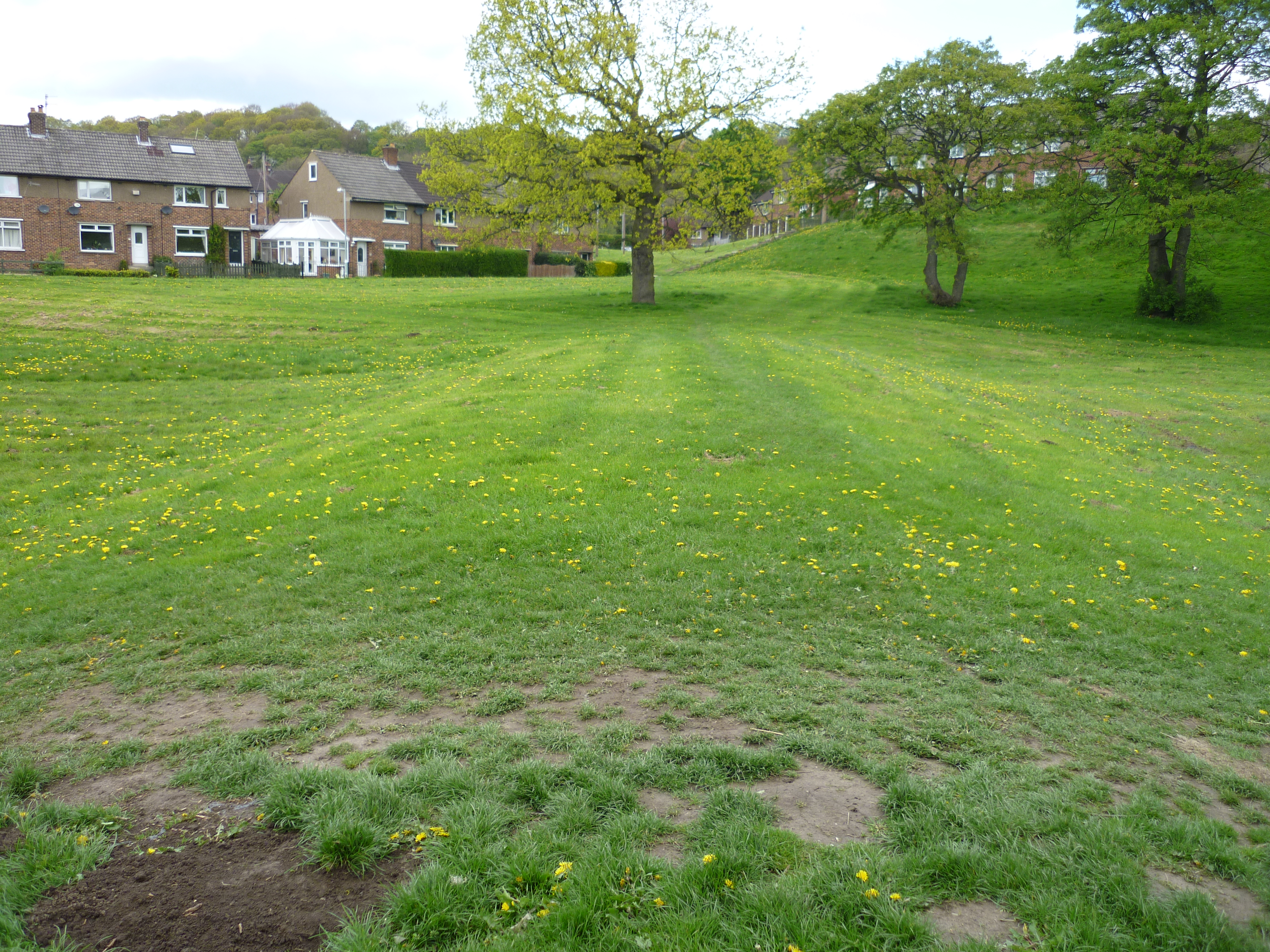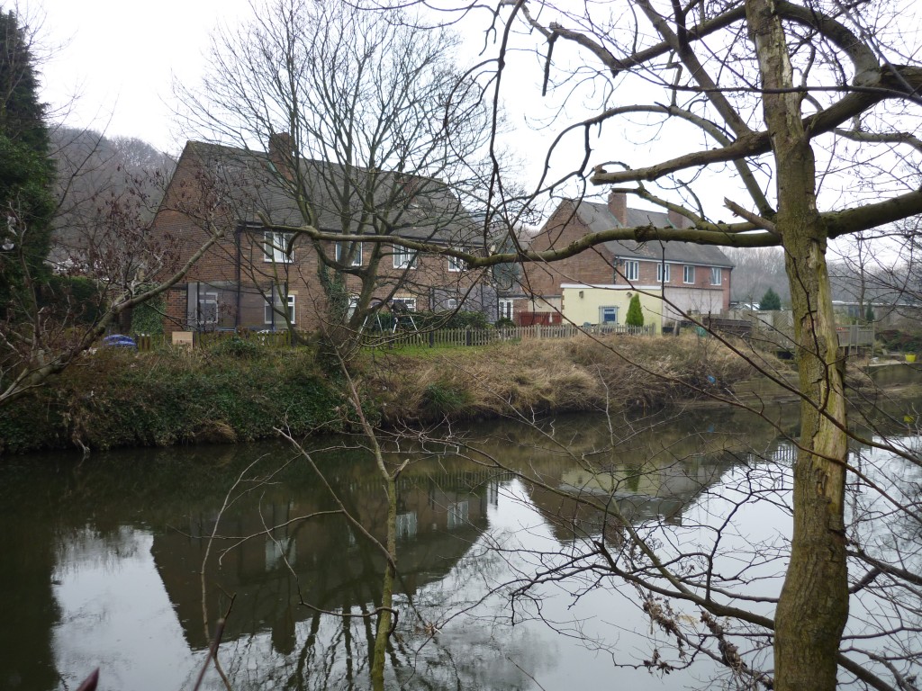 Most of the residential properties in this area are on the north side of the river – in an estate built by Shipley Council (in what is technically Lower Baildon) in the 1950s. The Coach Road estate was built on what was then marshland / flood plain — and it’s easy to see where the land was built up – away from the river – to make it safe for building on. A wide stretch of green flood plain separates the housing from river