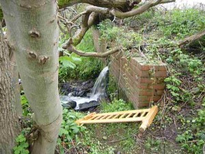 And here’s where that covered pipe, under the raised ground above, empties itself into the river. (Alongside a bed-head and an old TV…)