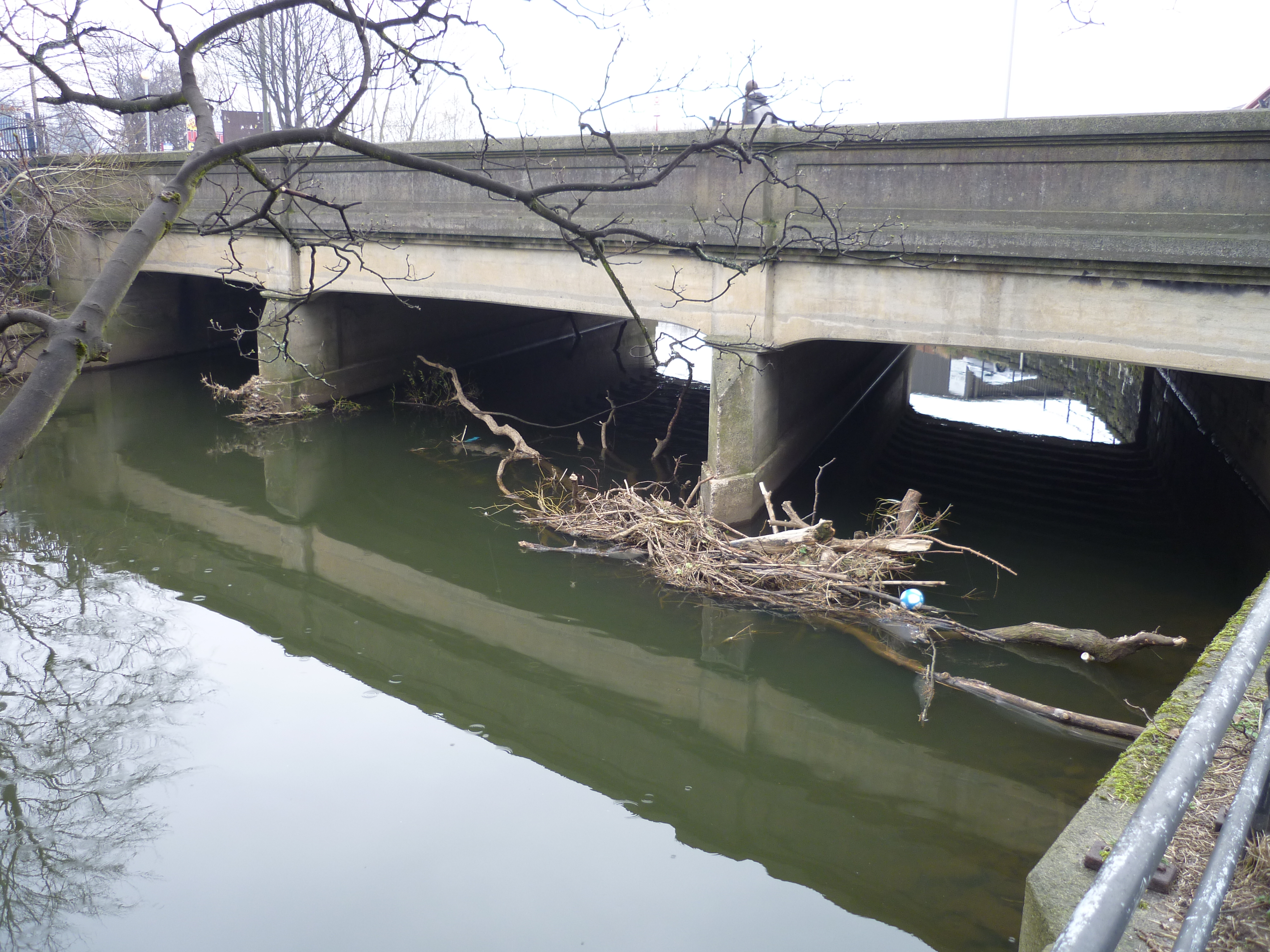textA little further downstream still, past barracks and another cricket pitch, we come to Baildon Bridge, the one and only road bridge in this area – which connects central Shipley (to the left/South) with Baildon and eventually Otley. Note the debris clustering at the bridge base though — when this builds up it creates a significant blockage problem, adding to flood risk in the area. In 2000, Baildon Bridge was temporarily closed because the road itself was well underwater…
