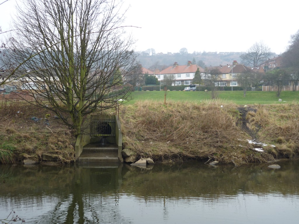 In the next image (below), further down the green space adjacent to the river, you can plainly see a rise in the land which covers over one of the drainage pipes channelling downhill water into the river… The houses in the background are part of Coniston Grove – just one of many streets named after major lakes, as if in recognition of the once very watery character of this landscape!