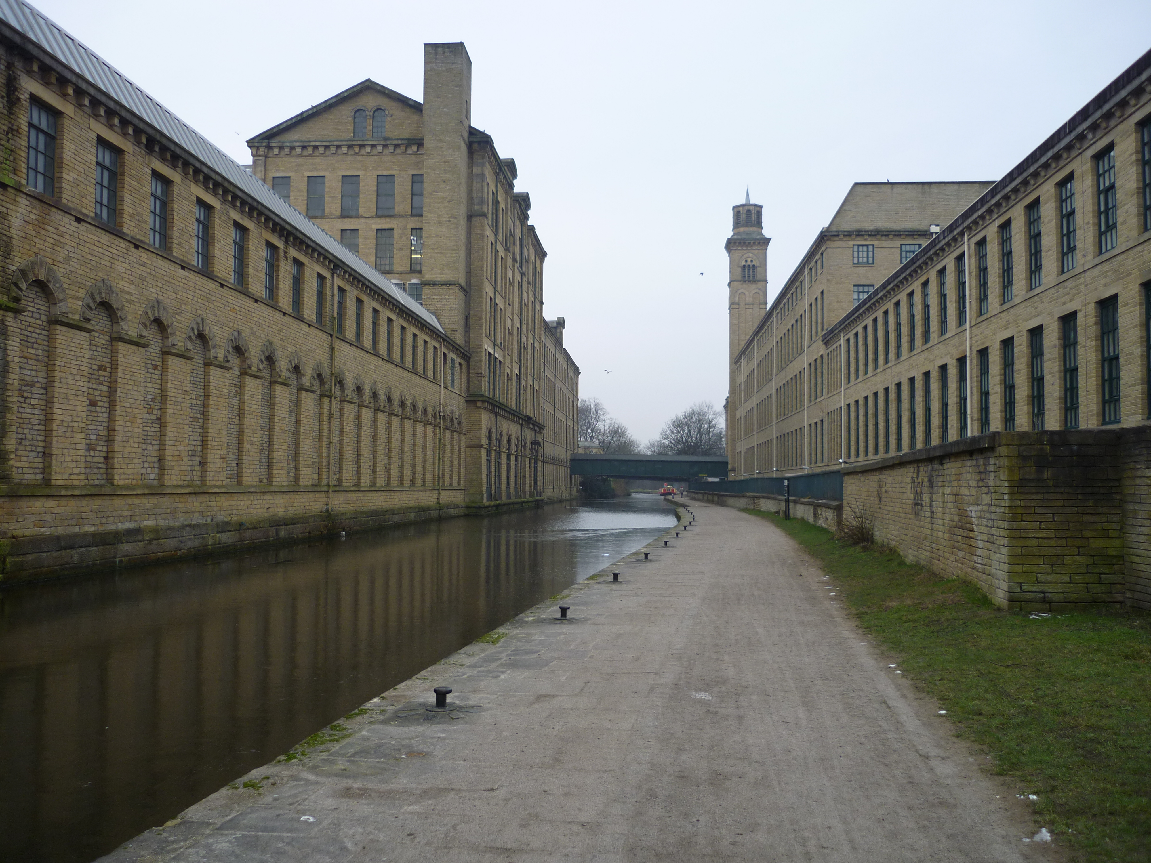 Let’s not forget the canal (below). At Saltaire, it sits especially close to the river, which is of course why Titus Salt put Saltaire here in the first place. The canal provided the key transportation route for the mill’s goods, whereas the river (directly on the other side of the mill building to the left) provided water power… is the river.