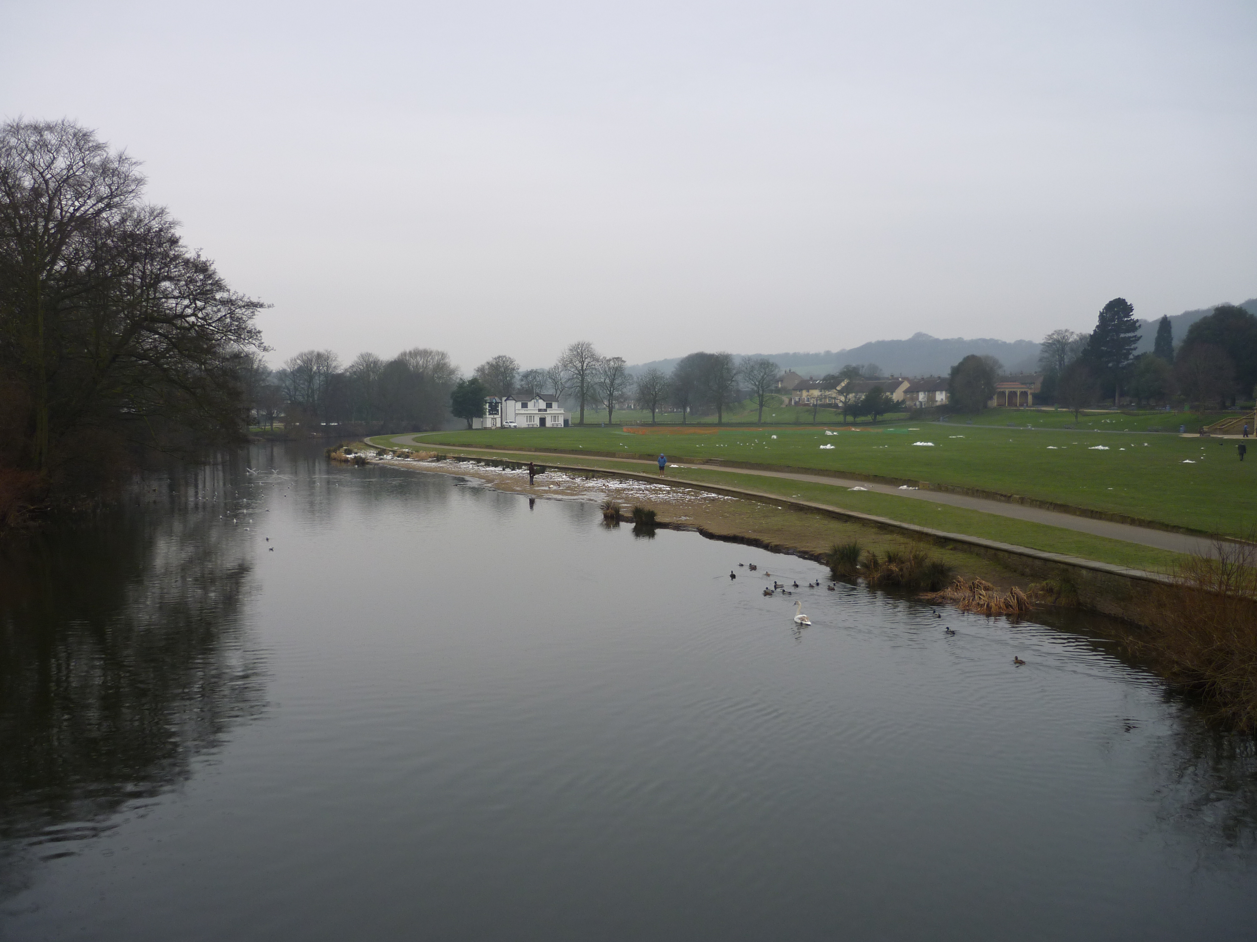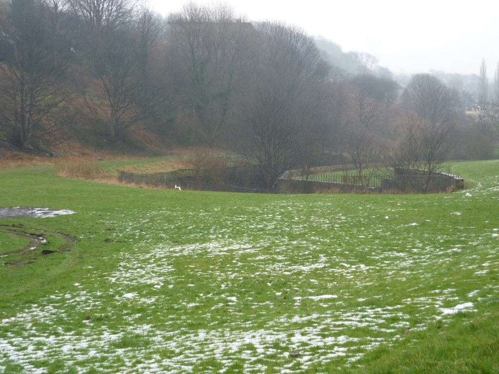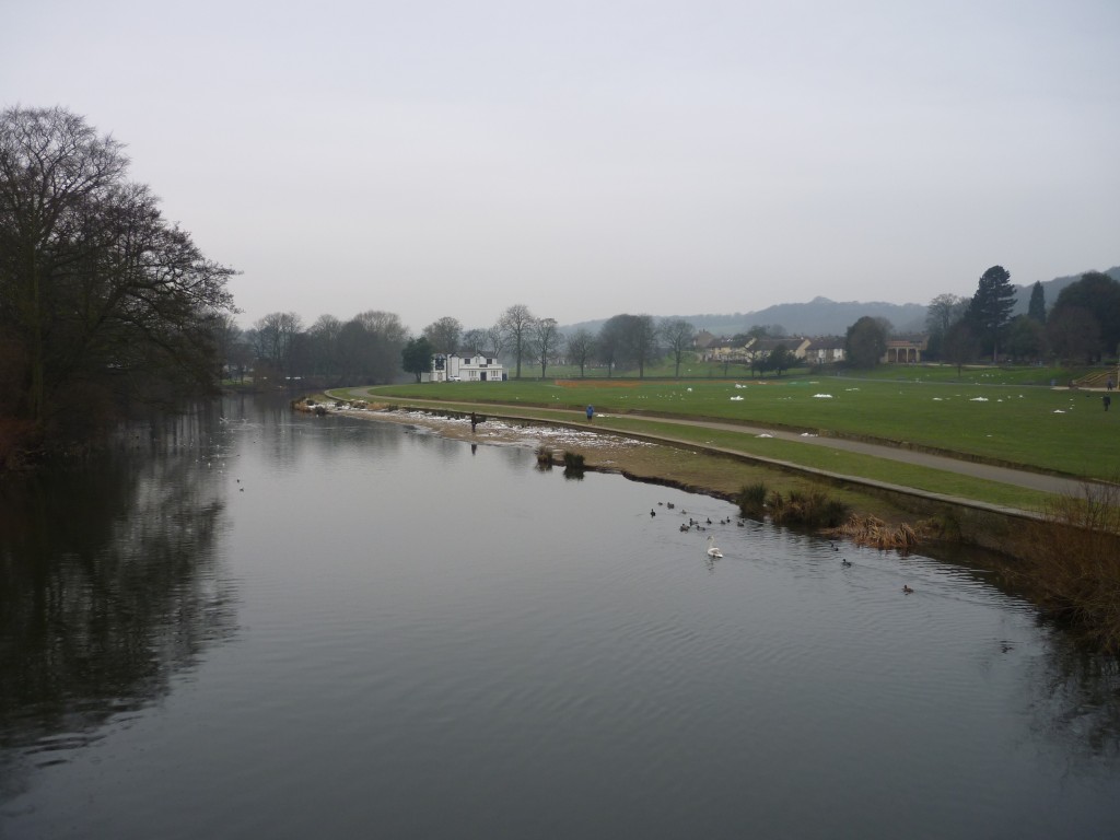 And here’s the reverse shot (below), looking west from the Saltaire footbridge, across Roberts Park towards the homes of Park Way in the distance… You can see clearly in this picture how the river bends around the park – and why, in flood conditions, this is the first place to ‘go under’