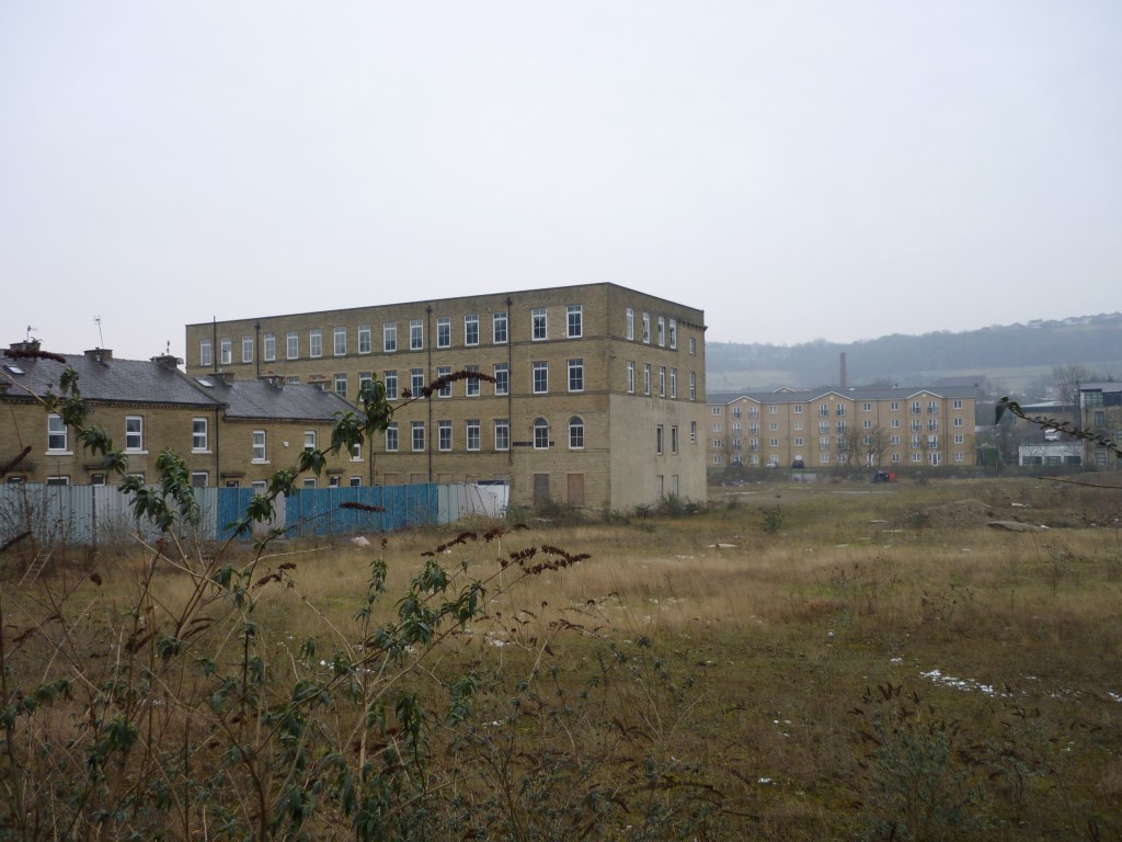 textA little further downstream still, that industrial landscape becomes industrial wasteland. Here’s Lower Holme Mills (now abandoned), and in the distance new housing developments on the Shipley side of the river.