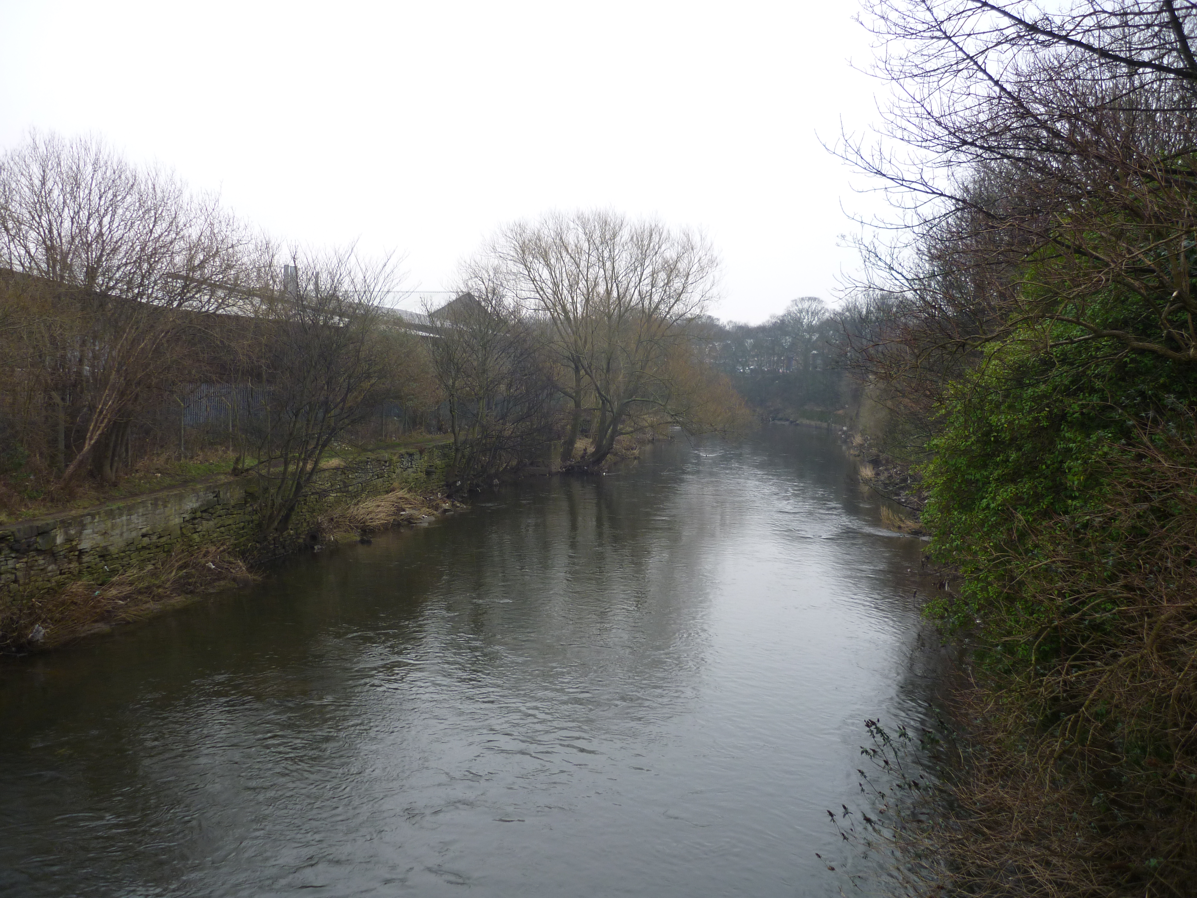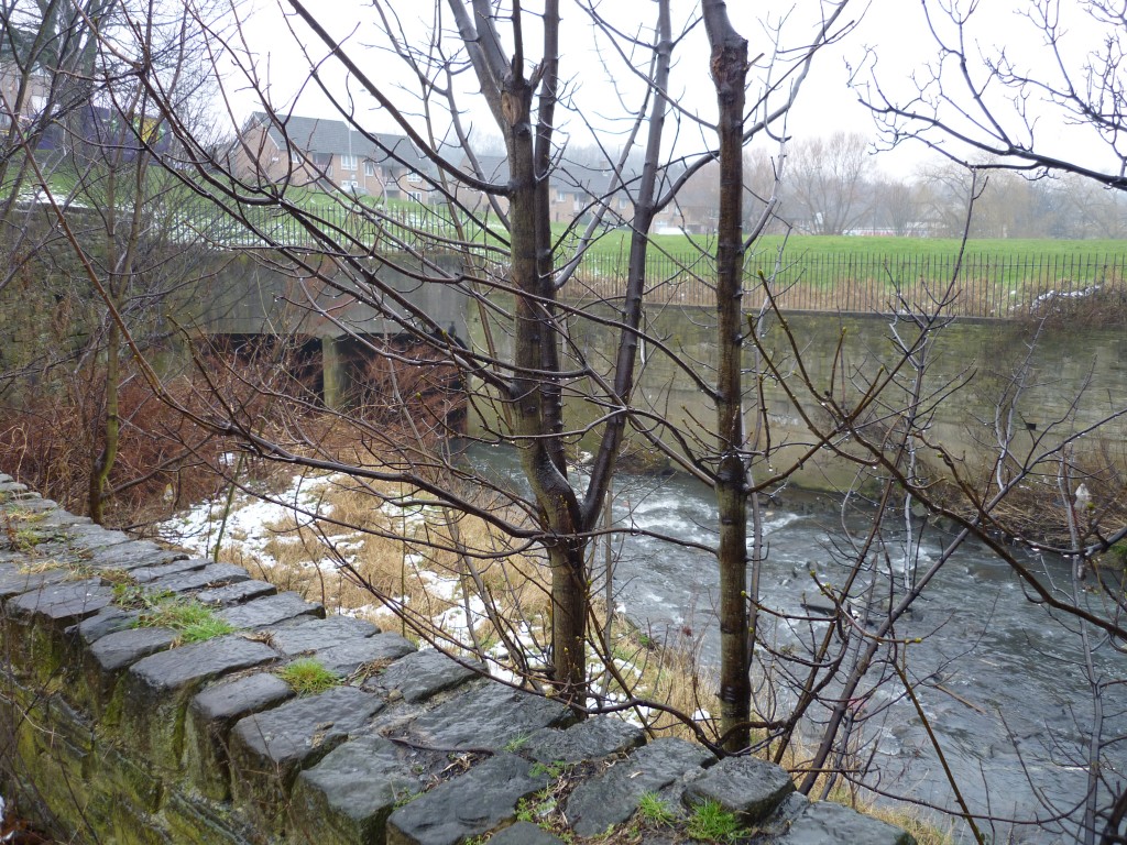 But let’s back up slightly here, and join Bradford Beck… (below) Having flowed north from central Bradford, it intersects with the Aire here — just downstream of Shipley Weir (which is just visible in the image below). The Beck is narrower than the Aire, and tends to be tucked well down at the bottom of high walls, somewhat obscured from view unless you’re looking for it…