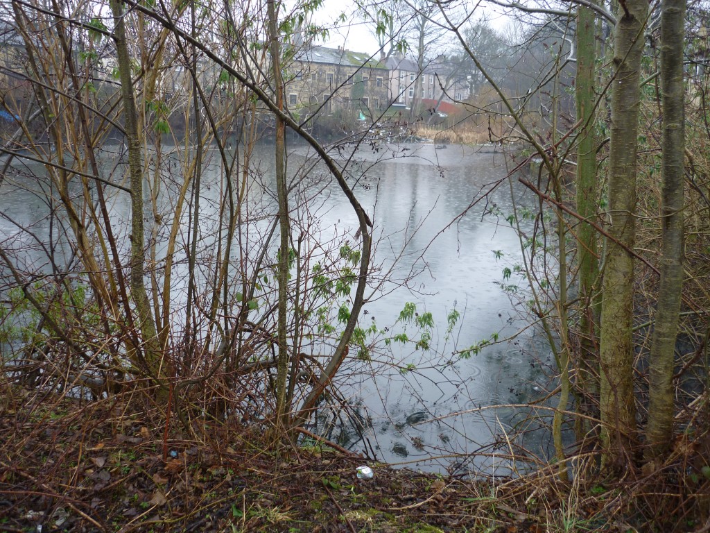 … somewhere beneath those arches, a tributary river known as Red Beck flows unseen into Bradford Beck, having flowed downhill in an underground culvert that takes it under the houses you can see in the back of the picture above. Actually, most of Red Beck is buried into the ground like this, but a little way uphill — tucked between Wharncliffe Road and Norwood Avenue — it pops up to the surface as an unexpected little urban lake…