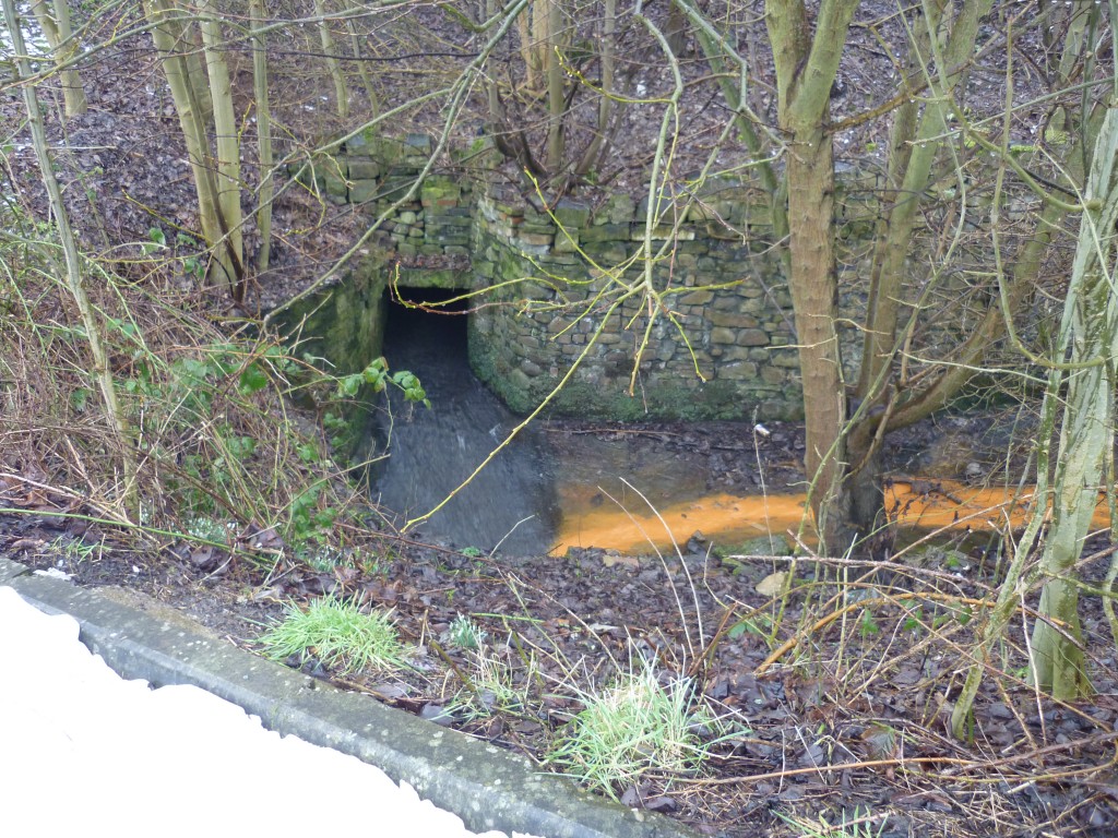 This ‘lake’ decants then decants itself into a narrow, fast weir that takes it down a steep incline before emerging again briefly through the little square arch in the image below… where it is joined by another small tributary (coming from don’t-ask-me-where) which is coloured a delightful shade of orange…