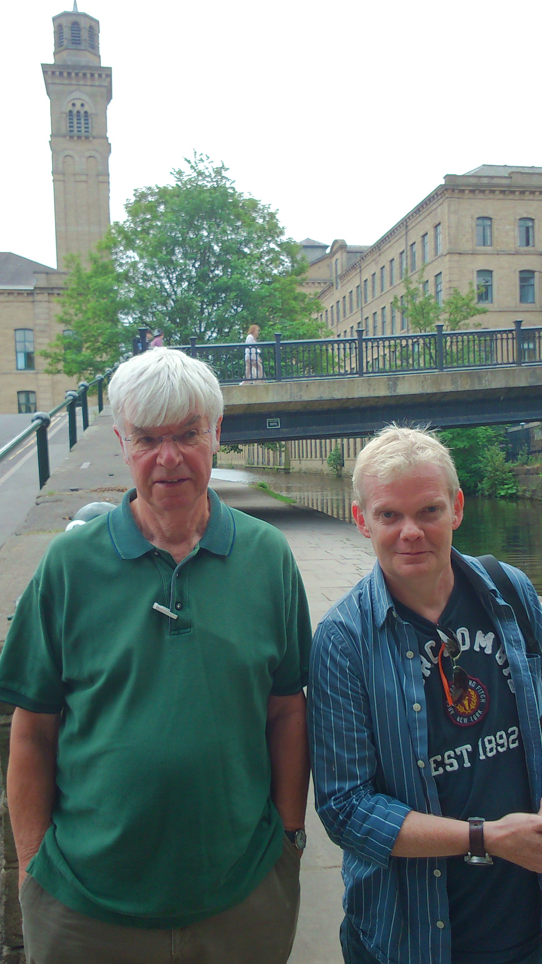 The audio guide, titled Salt’s Waters (Eddie’s suggestion), will connect mill and ruin via various local waterways. There’s the River Aire and Leeds-Liverpool Canal, most obviously, but also Loadpit Beck (which flows into the Aire near Bradford Rowing Club, and which marks the boundary line between Baildon and Bingley land). There’s also the even lesser-known Little Beck, which passes through the Milner Field estate and was once dammed to create a boating lake for Titus Jr. and his family and guests (who included royalty, no less!). Little Beck is the chosen subject for the new song Eddie has written to be mixed into the audio guide, and which will thus have its world premiere at Half Moon Cafe. It joins other watery songs in the Lawler canon, including those dedicated to the Bradford Canal (written for Blue Route), and of course Bradford Beck — an older song which is now the unofficial theme tune of the Friends of Bradford’s Becks, and also features (thanks Eddie!) on my short film Wading to Shipley. That film, incidentally, was expertly edited by Lee Dalley, of Leeds University’s Workshop Theatre, who is pictured above with Eddie last week… (they had just met for the first time!)