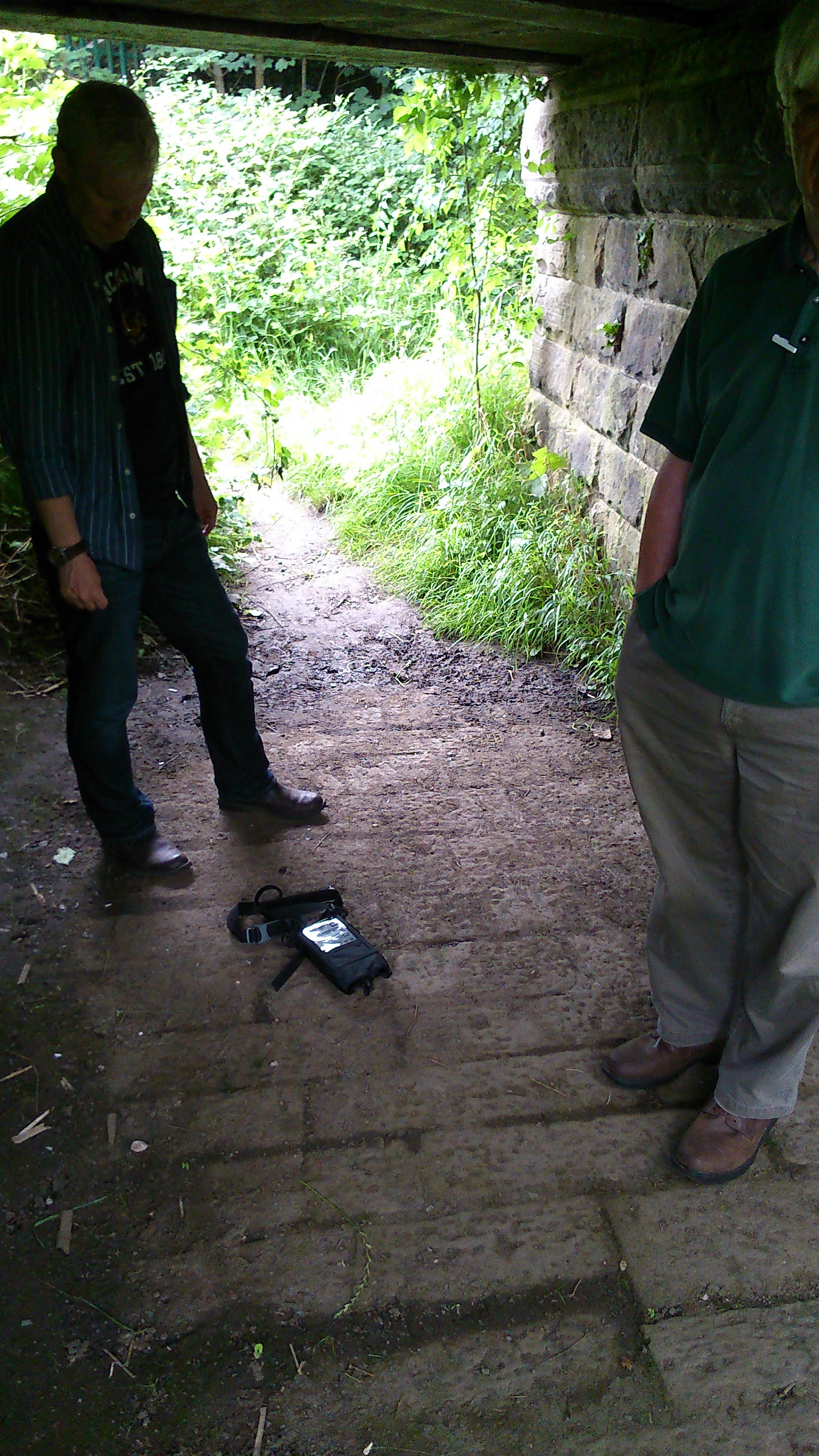Lee has generously undertaken to sound-design our audio guide — mixing my words and Eddie’s music with layered sounds of his own… So he came out to walk the route with us and record sound samples along the way. Here he is with his recorder (and Eddie) underneath the Barden aqueduct — which crosses the Aire at one end of the Higher Coach Road estate. Lee wanted to catch the echoing sound of the river’s flow, as heard just here… He also will have captured the electronic click of my phone-camera taking this shot, but when I apologised he said he loves that kind of random sound interference. Who knows, maybe the ‘pling’ will find its way into the final audio mix!