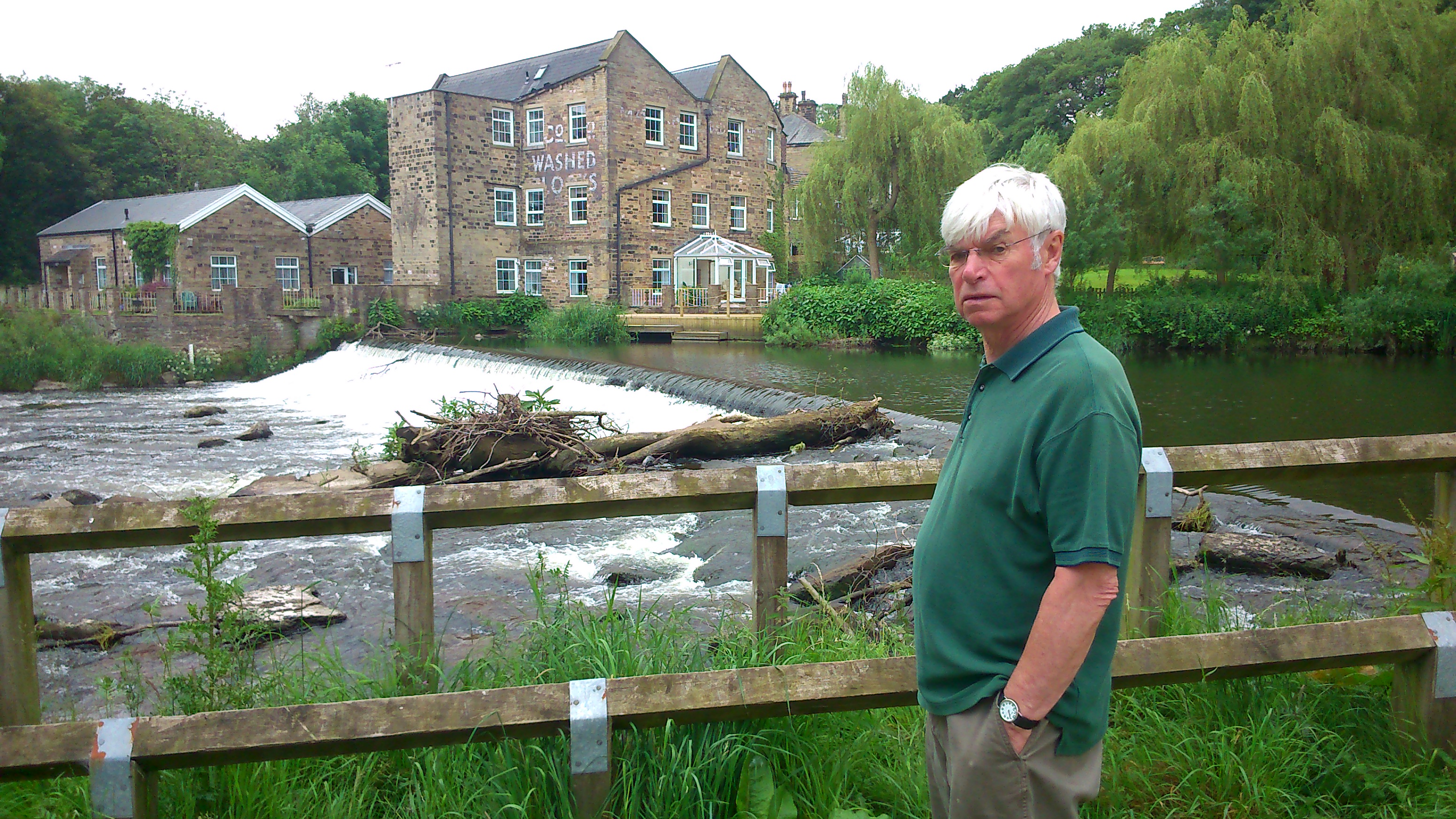 Here’s the ‘bard of Saltaire’, Eddie Lawler, snapped last week up at Hirst Weir (which has yet another tree straddling it…). Eddie and I will be presenting a one-off gig on September 18th at Half Moon Cafe in Roberts Park — Eddie playing his guitar and singing, me doing a little spoken word… It’s a double act we first developed on the Blue Route of our performance tours in 2012-13 (see ‘Performances’ tab), and which we both enjoy. The Half Moon event will really just be a public launch, though, for a longer-lasting but less visible performance — which you’ll be able to experience in the form of a downloadable audio guide. This will take listeners on a walking tour from the bottom of Victoria Road, in the heart of Saltaire, and north-west to what remains of Milner Field, the grand mansion built in the 1870s by Titus Salt Jr., and now just a pile of stone overtaken by self-seeded woodland…