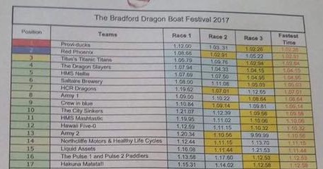 The eventual winners, Provi-ducks (up from third last year – well done them!), are presumably representatives of the Provident Building Society. You can’t always tell a lot from the names these crews choose to call themselves, but Dragon Boat Festivals are conventionally set up (this is true at the annual Leeds Waterfront Festival too) as opportunities for businesses to do a bit of “team building” among staff. For the privilege, they pay a hefty entry fee, which goes to the Lord Mayor’s charities and the organising company.