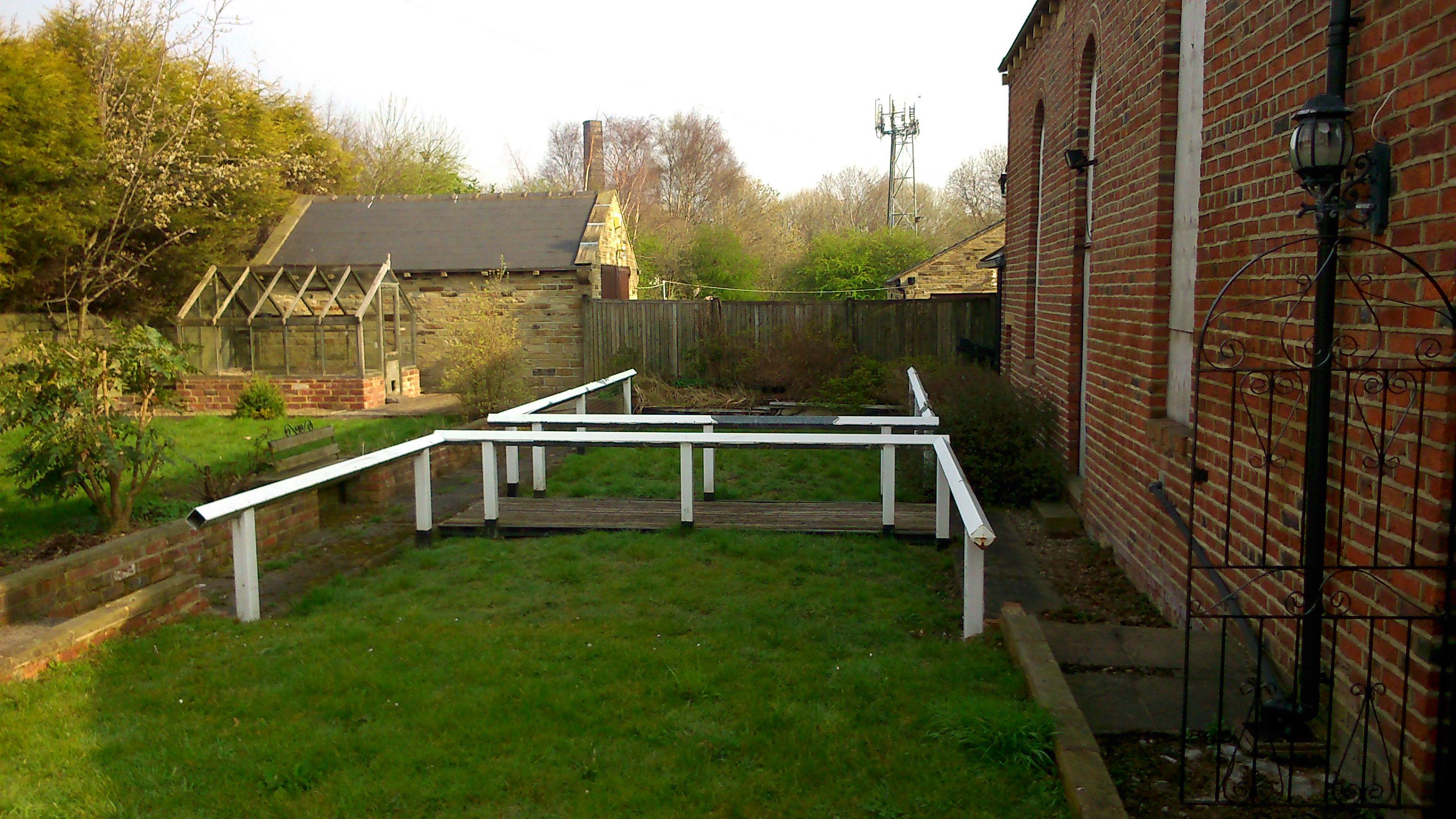 This was Roberts Park, in Saltaire, shortly before 12 noon, with the sun very much shining. Starting at the park’s bandstand, Eddie and I welcomed an audience of 15 or 20 intrepid walkers, who had come along to journey with us along long watercourses towards the ruins of Milner Field mansion — the “lost” country home of Titus Salt Jr.