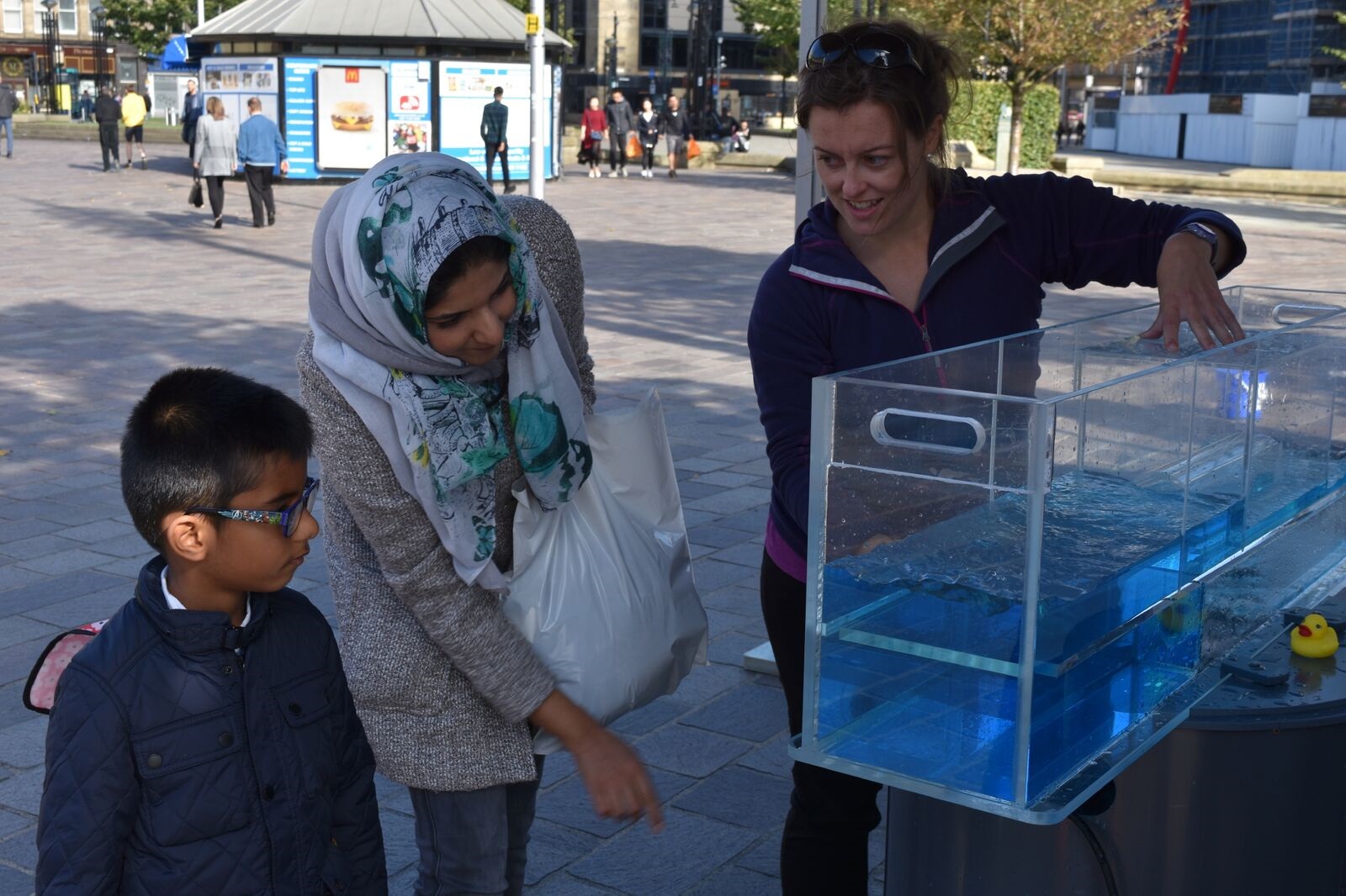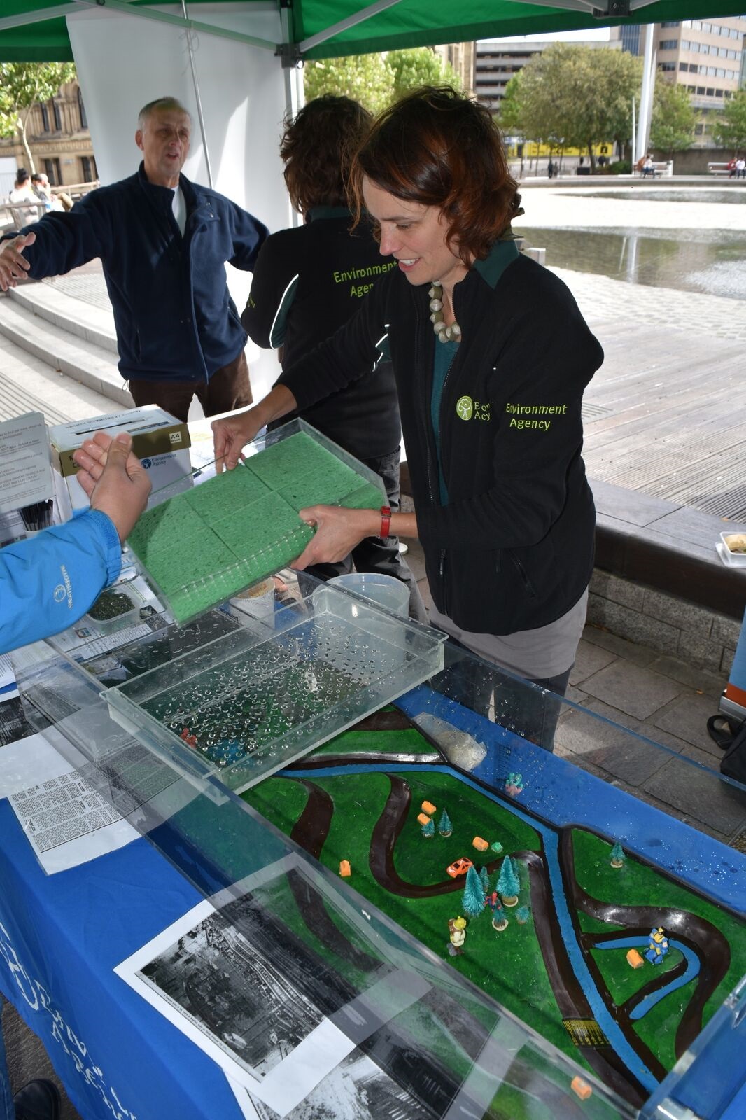 Across the street in Bradford’s City Park area, there were more under-trafficked gazebos and marquees, including the one from which Bradford Community Broadcasting (BCB) was live-casting for the day. Eddie and I took time out from our stall location to speak with host Mary Dowson — who was as engaging and on-the-ball as ever — about how and why we both got involved in using the arts to talk about water.