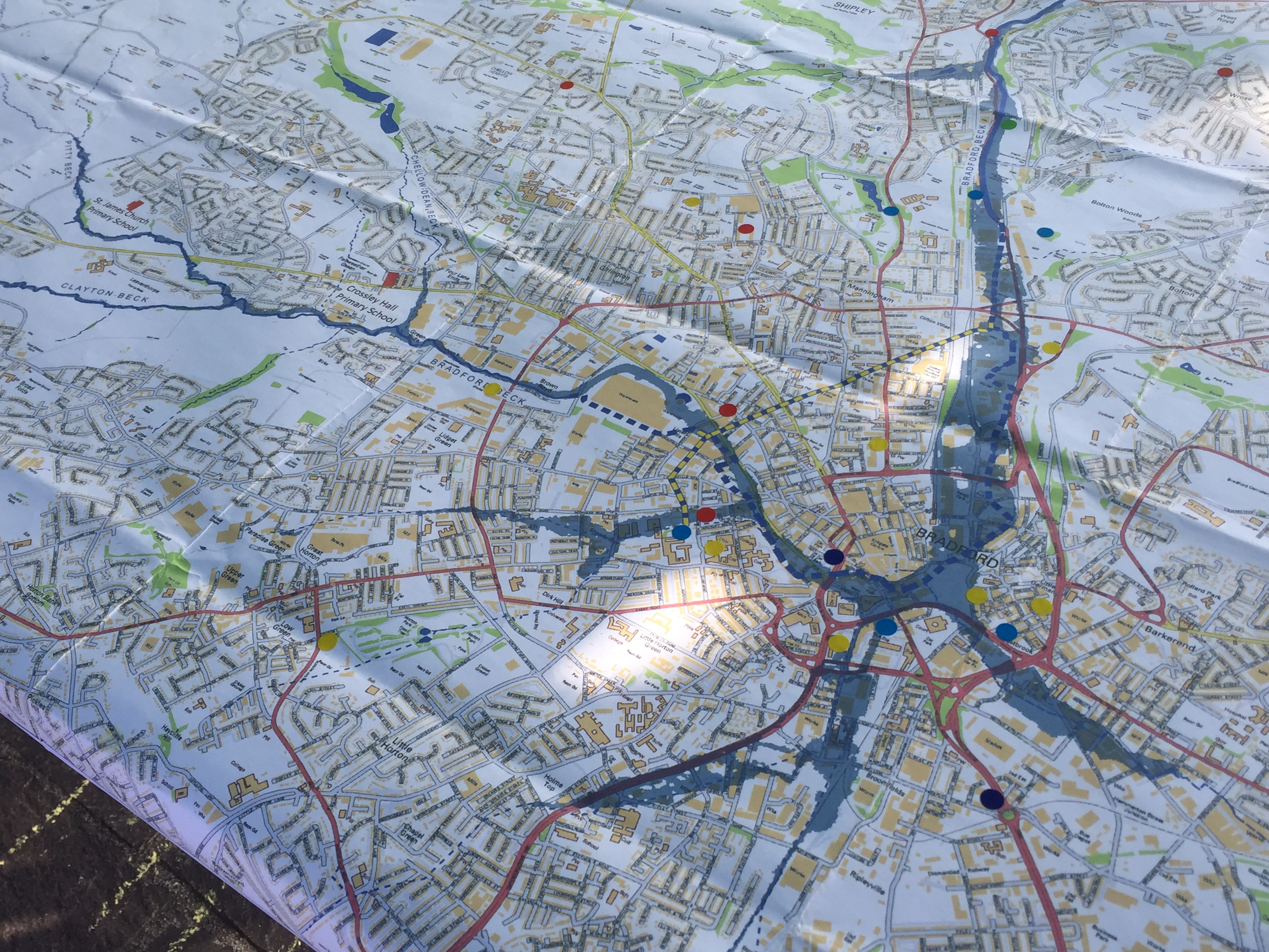 This was my vantage point on Tyrell Street for much of the afternoon. Eddie and I were supposed to be singing songs and telling tales of Bradford Beck, as part of the weekend’s Bubble Up festival — a water-themed arts extravaganza which had events dotted all around Bradford’s city centre. I was also attempting a bit of story-gathering as well as telling, by using a hand-drawn map of the city centre — showing the Beck’s hidden journey under its streets — and inviting passers-by to add their own annotations about memories of city centre locations. The memories added went as far back as 1968, but the map didn’t get nearly as populated with text as I had hoped, because (as the picture tells you) the footfall from shoppers was poor and getting poorer all afternoon — even as the rain poured and kept pouring…
