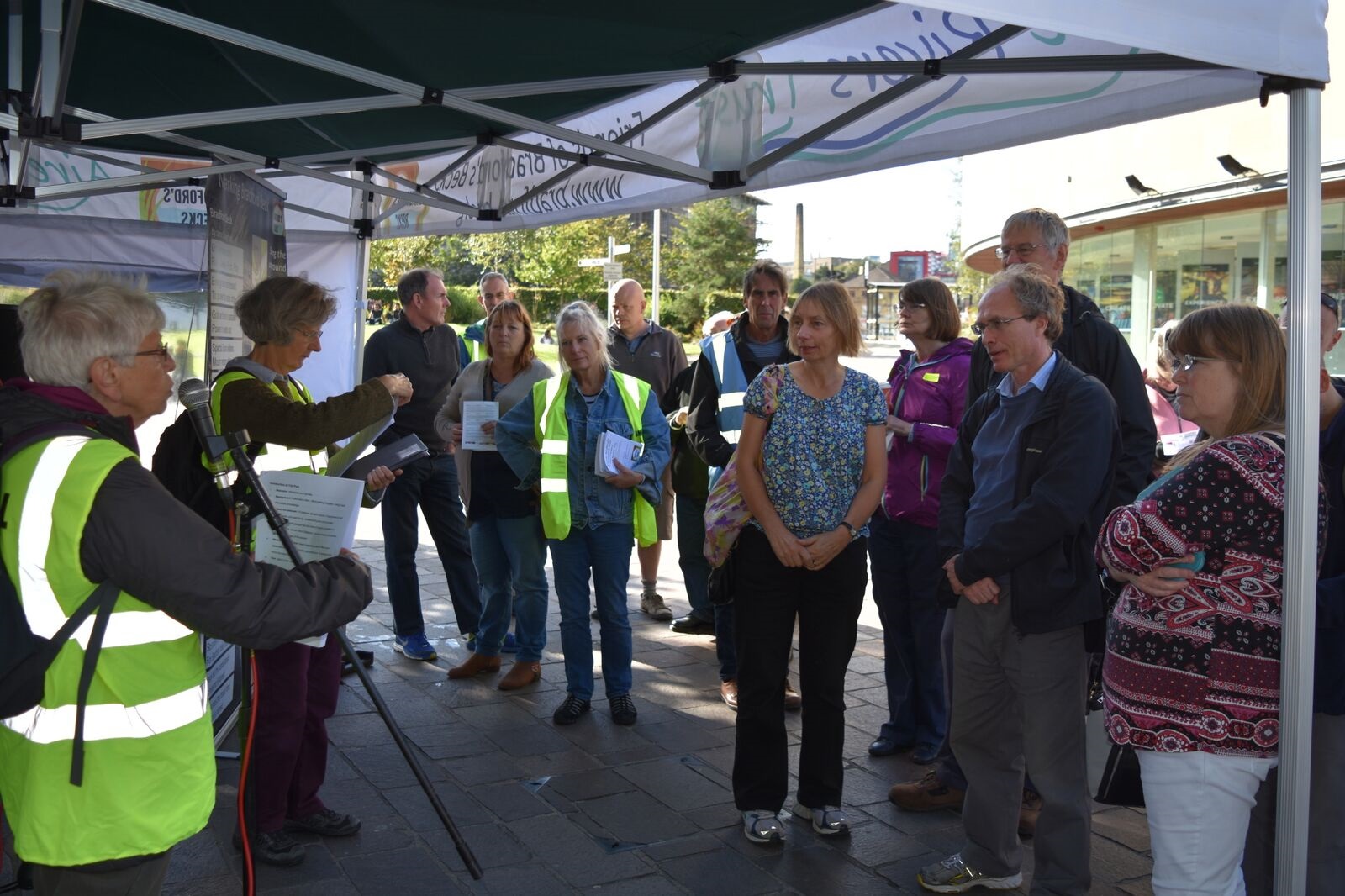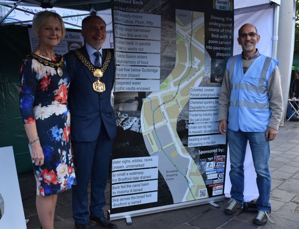Here’s Eddie, smiling as ever, and undaunted by the weather, even though there wasn’t — in the end — much meaningful opportunity for him to use that microphone to sing. He’s huddled under the Friends of Bradford’s Becks’ portable gazebo, along with fellow Friend Elizabeth, who was timetabled to lead walks along the route of the Beck through the city centre — via the plaques that are now placed in the pavements at key intervals.