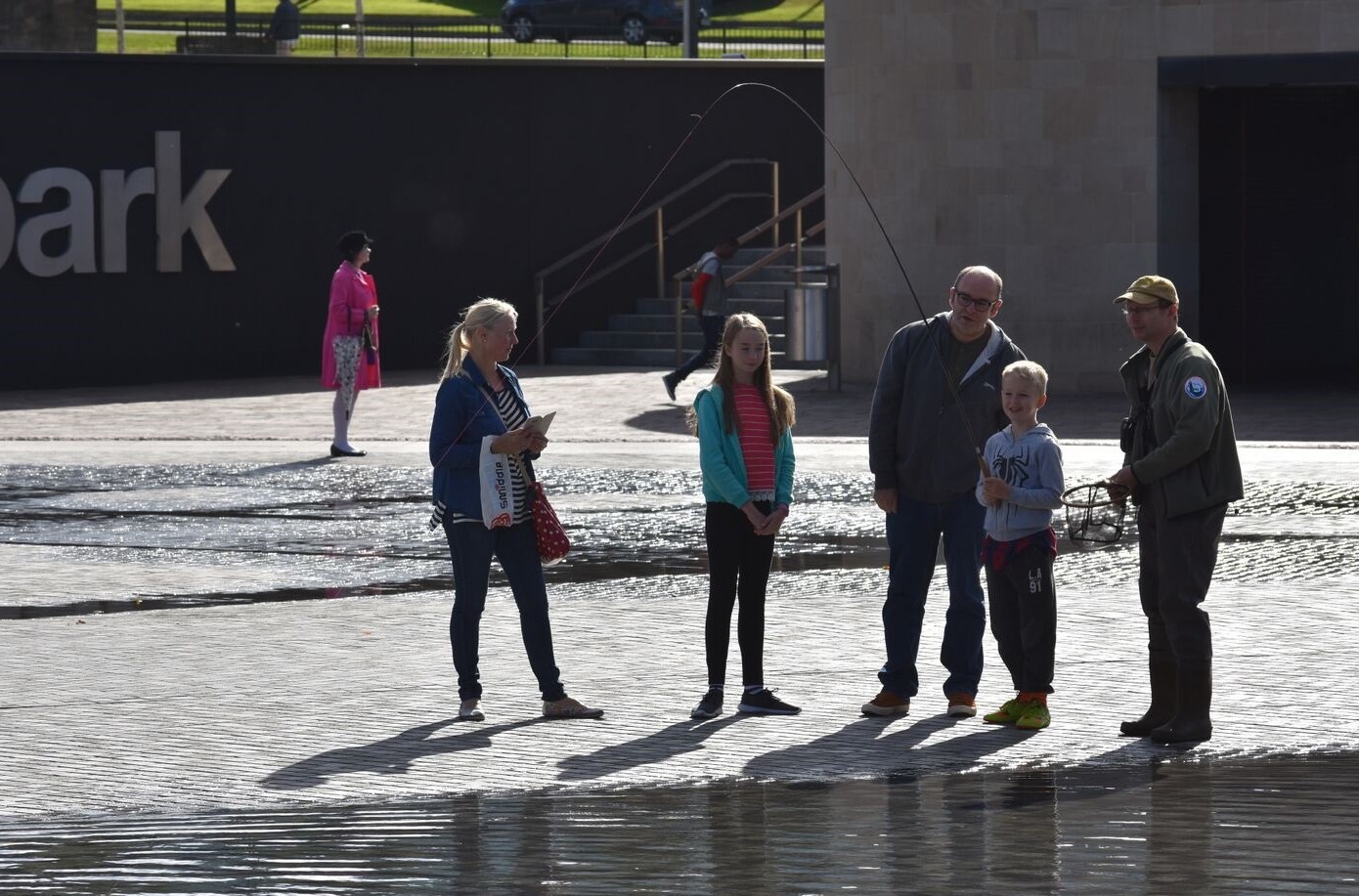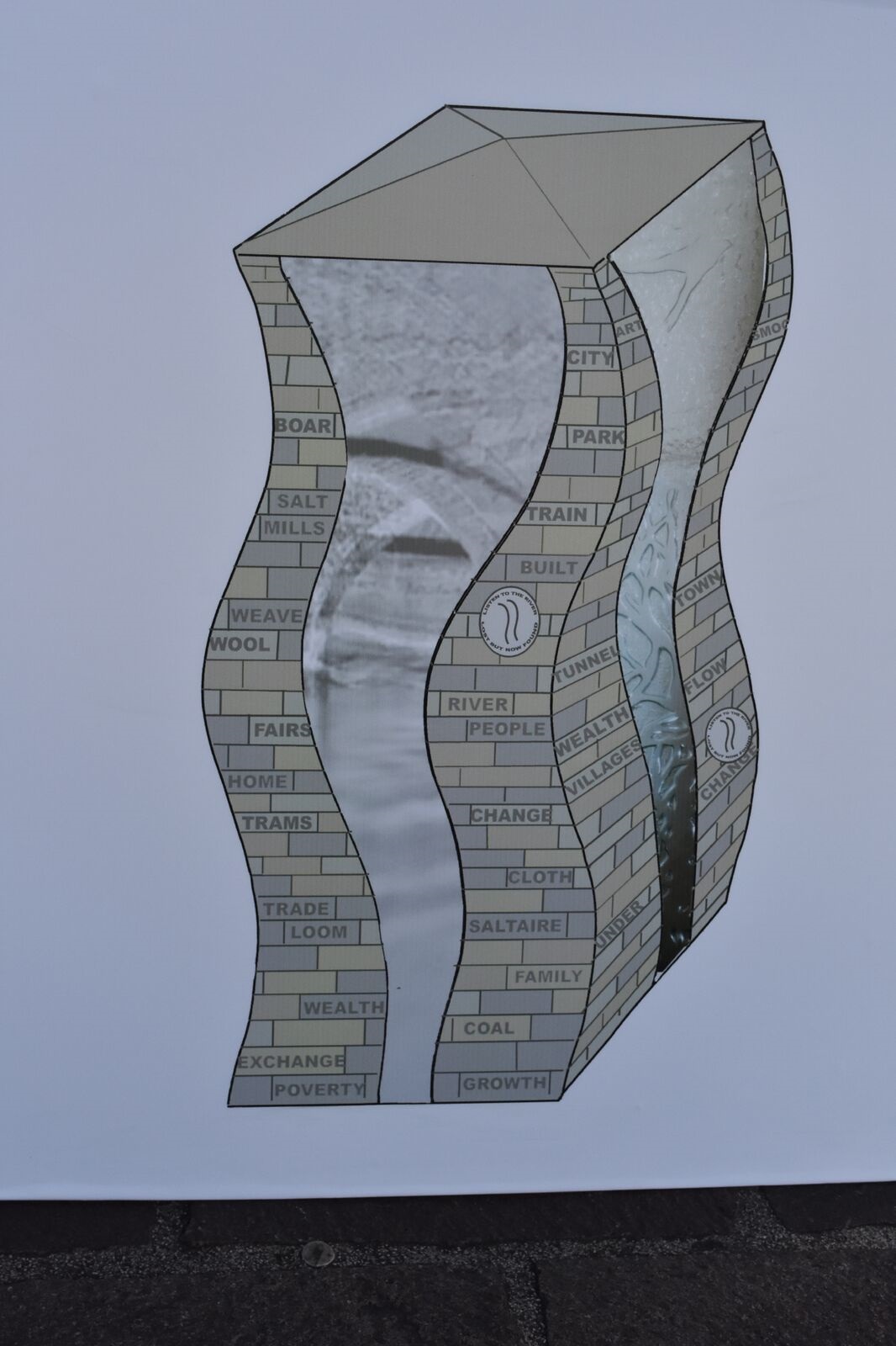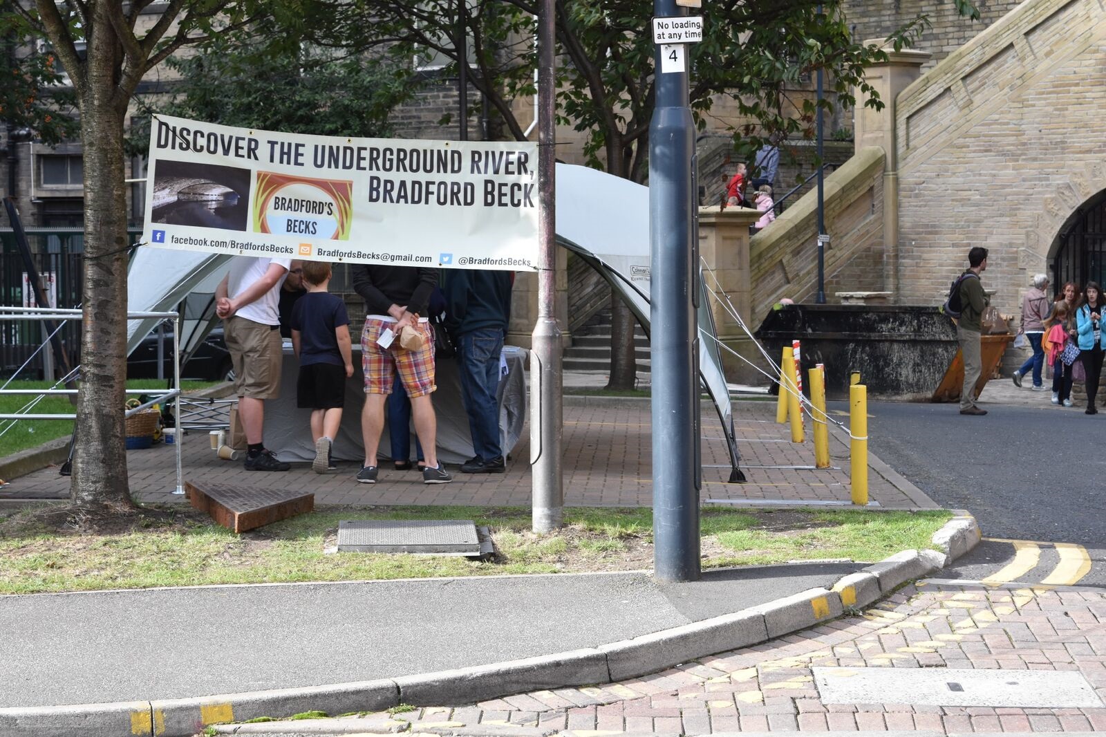 Just past the gazebo, FoBB had opened up a manhole cover and surrounded it with a safety fence — as well as a polystyrene mock-up of a slate sculpture by Alex Blakey that’s being planned as a permanent feature… By looking down the hole, you can see Bradford Beck streaming by beneath the street. Although only the most educated observer would be able to distinguish the beck from a storm drain, passers-by were nevertheless intrigued when told that this was the hidden river around which the city was first built….