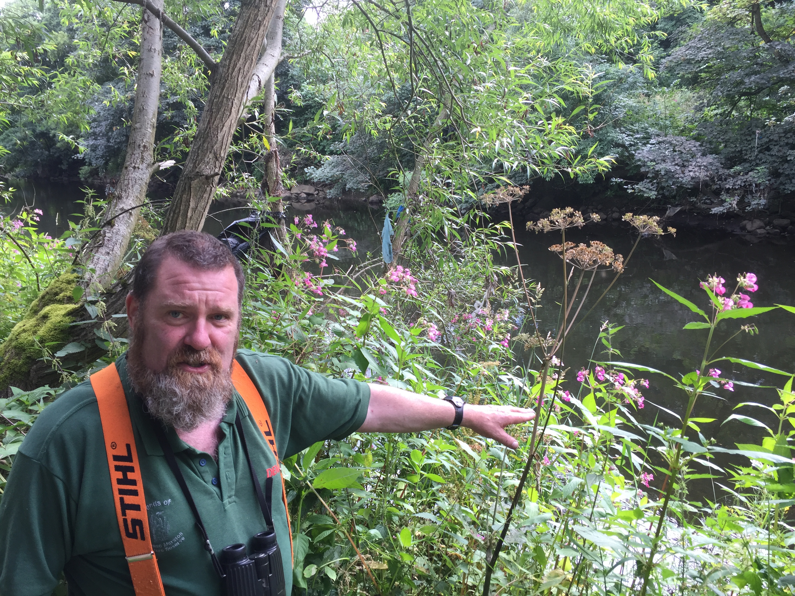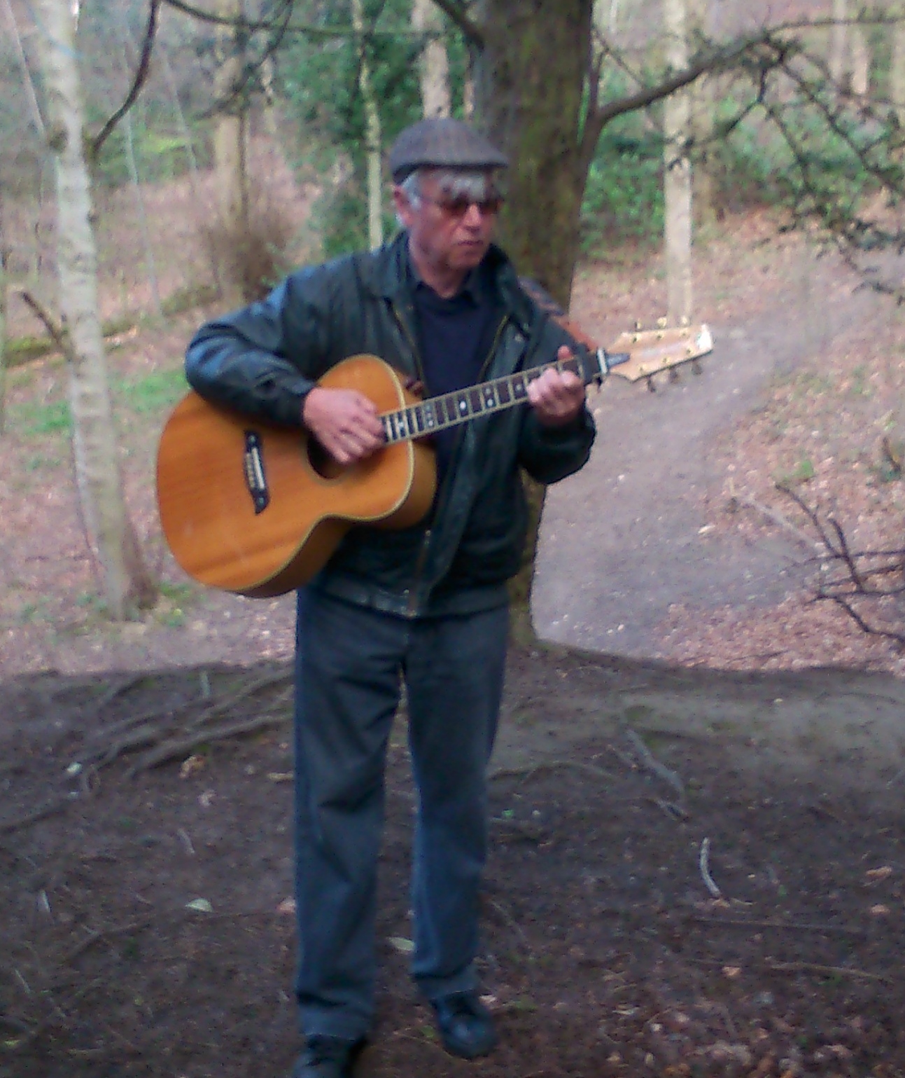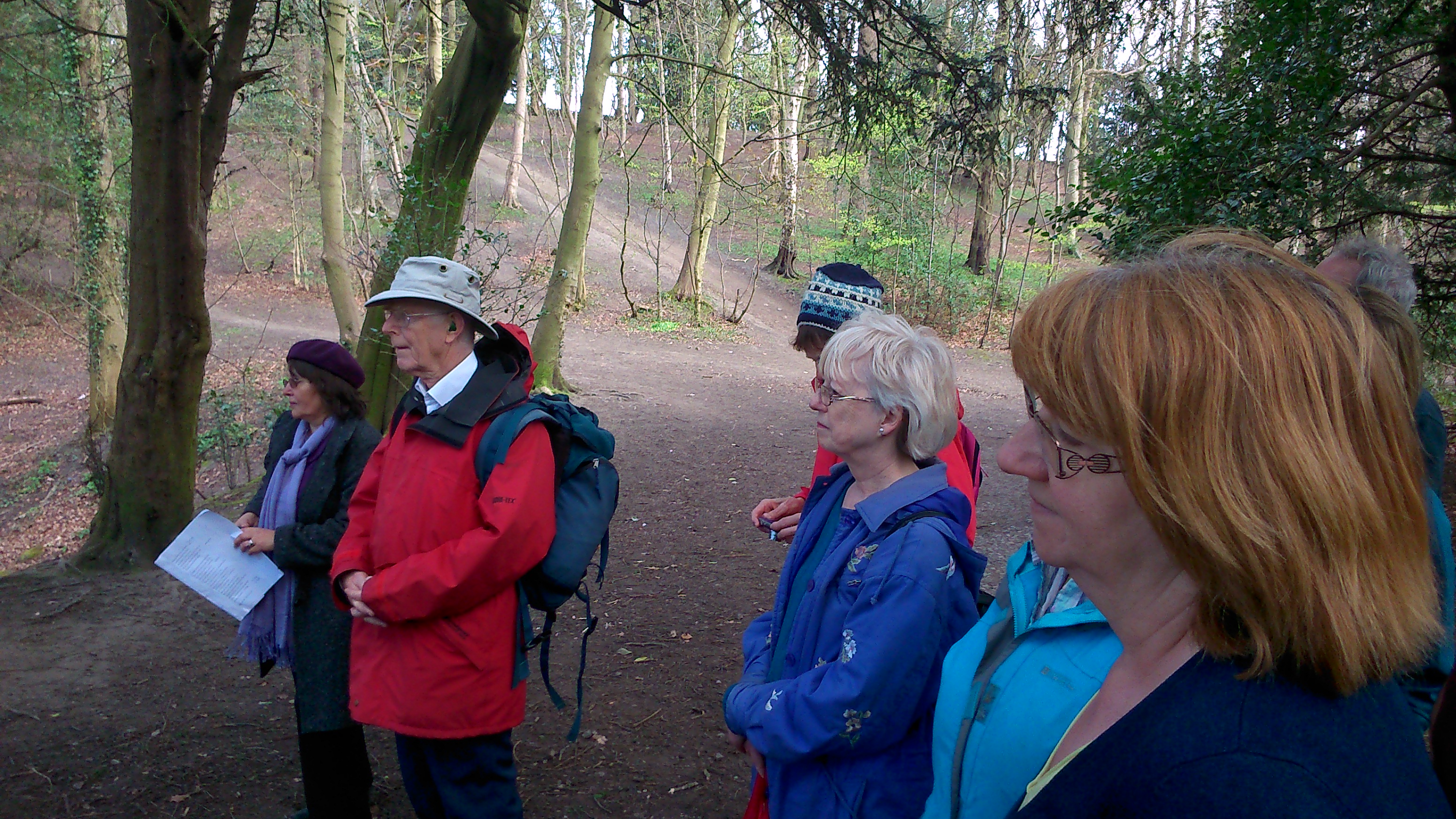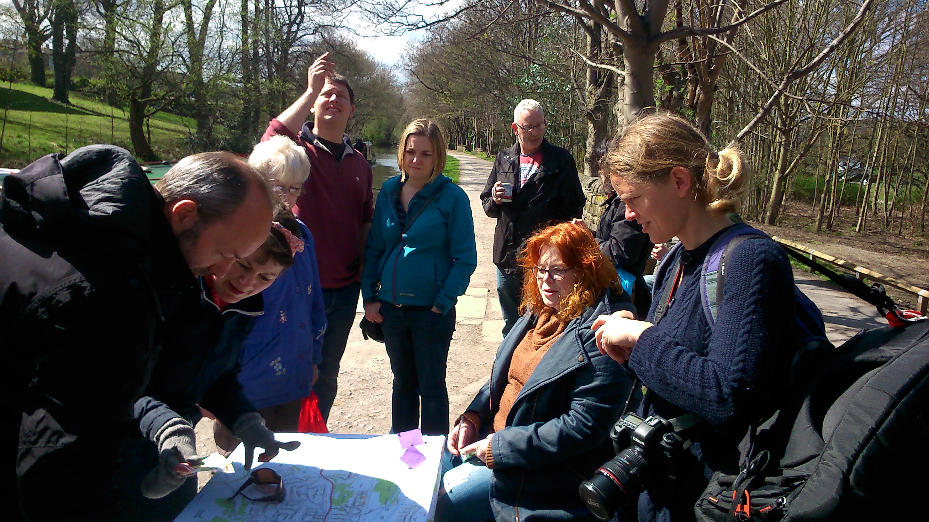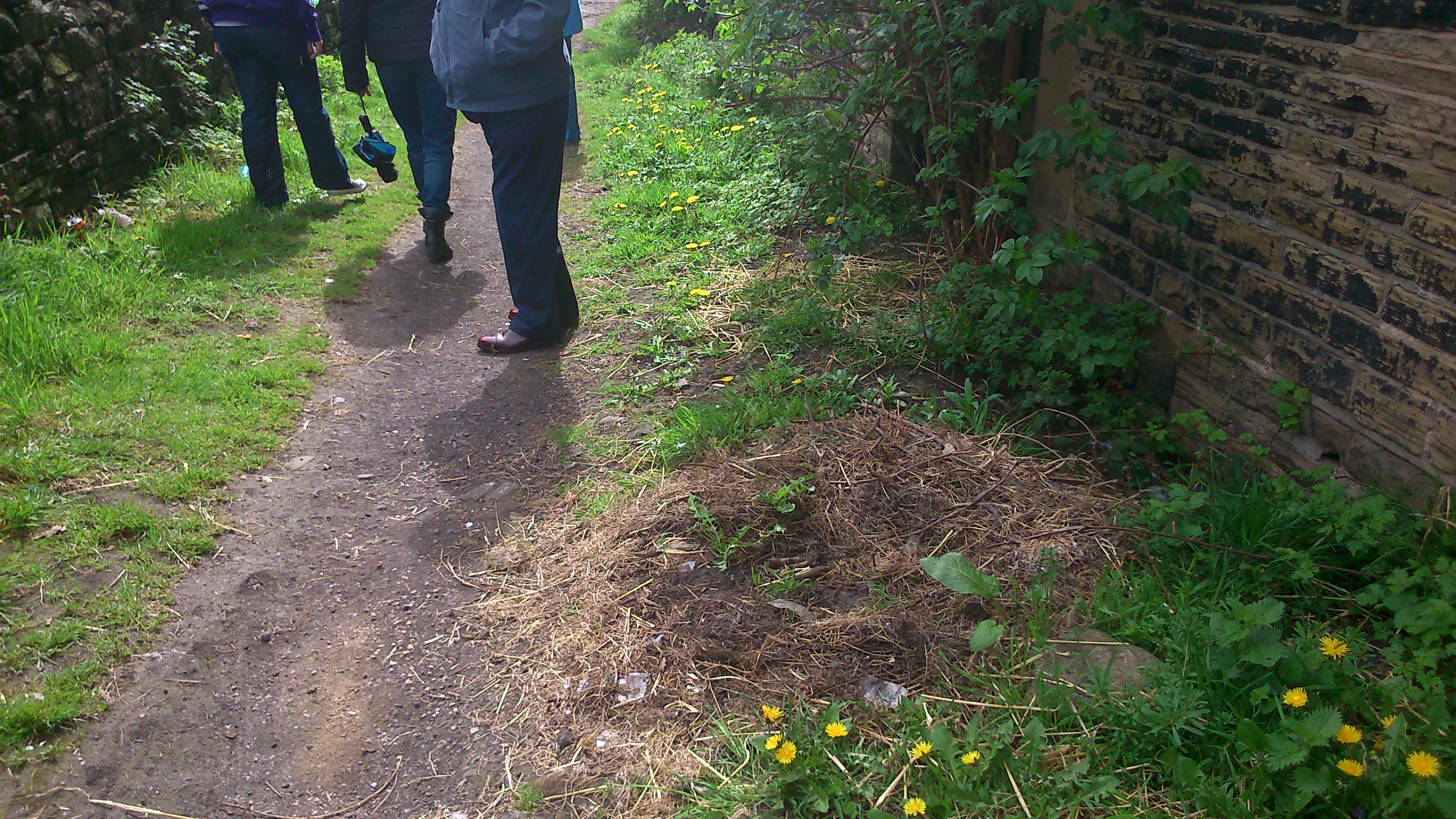 The walk was in some ways a “live remix” of parts of the Salt’s Waters audio tour (still available for download!) that Eddie and I made the other year. Our title, The Ballad of Little Beck, came from the song of the same name that Eddie wrote for the audio guide, and which tells the story of the Milner Field mansion from the point of view of the small brook that flows through the grounds and was once dammed by the Salts to make a boating lake (again: river songs in the first person!). But the balladeering theme was taken in a different direction for this new walk, as we performed a selection of poems along the way, by local poets of the Salts’ era. In the picture above, Eddie is singing — to a tune of his own devising — the poem “Come to Thy Granny” by dialect poet Ben Preston, who built the Glen pub in Eldwick. We didn’t go quite as far as Eldwick (that would have been a long walk), but instead performed this on the path towards Eldwick, just before we turned off in another direction.