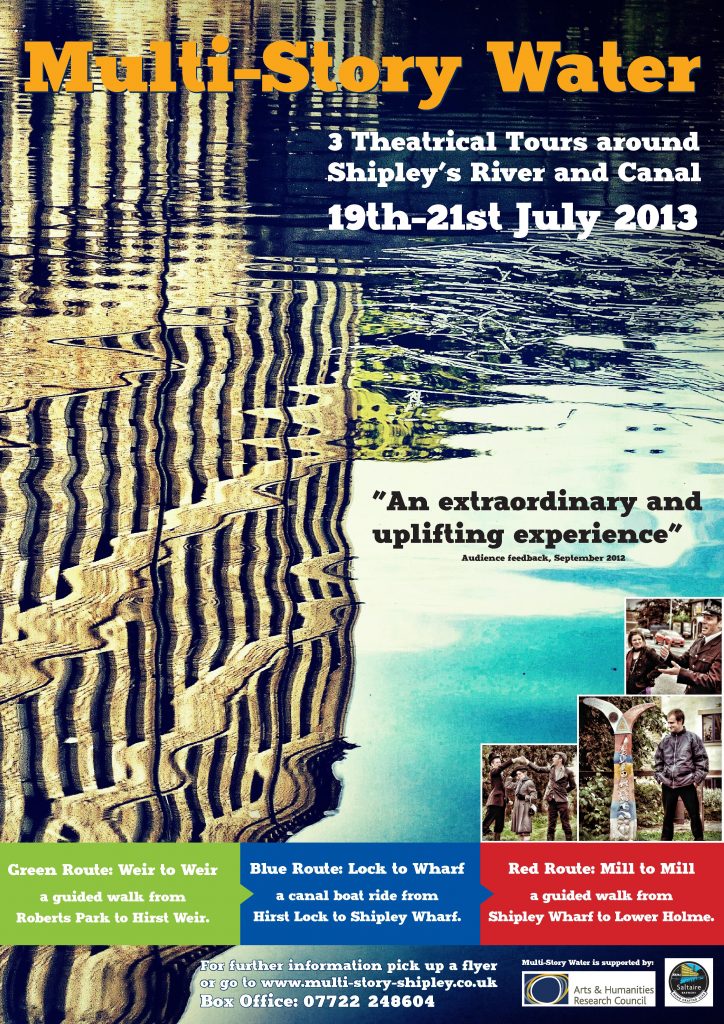 Our original Multi-Story Water theatrical tours of the Shipley area were created for performance in September 2012, and then revived with some revisions in July 2013. On both occasions, they took place in three interlocking parts, which were presented five times each over the course of a single weekend (once on Friday, twice each on Saturday and Sunday). Each part ran for about an hour, and spectators could choose to experience all three as a single ‘cycle’ or to come along to different sections over the course of the weekend. The three parts were: