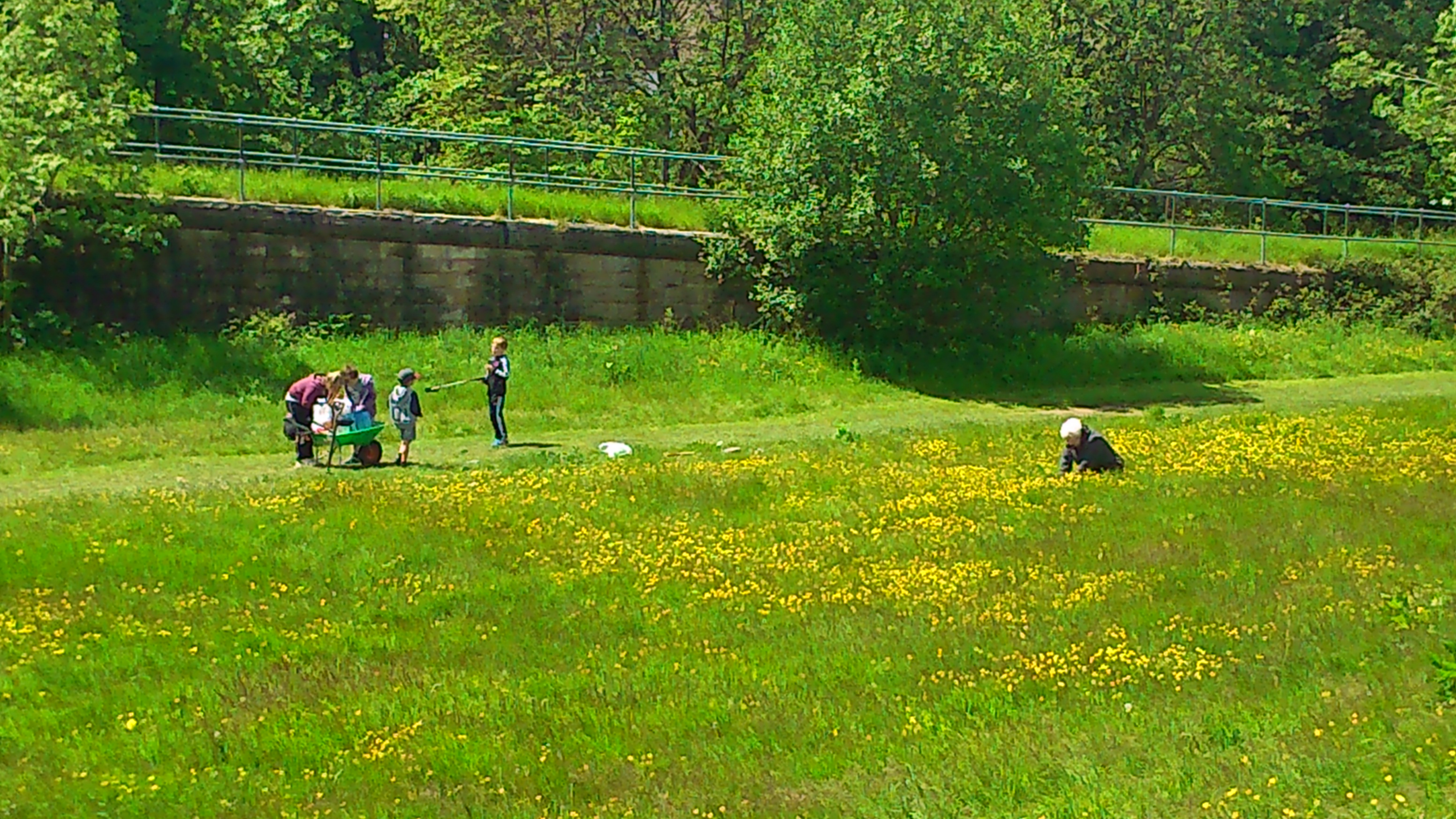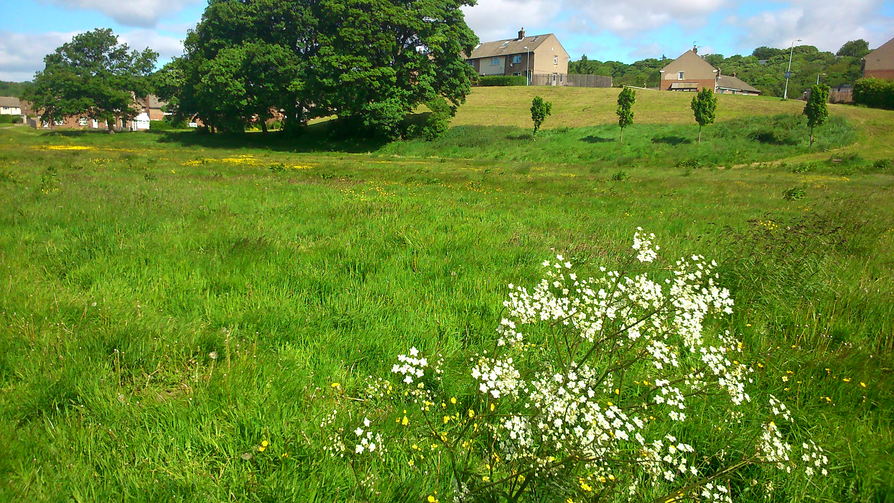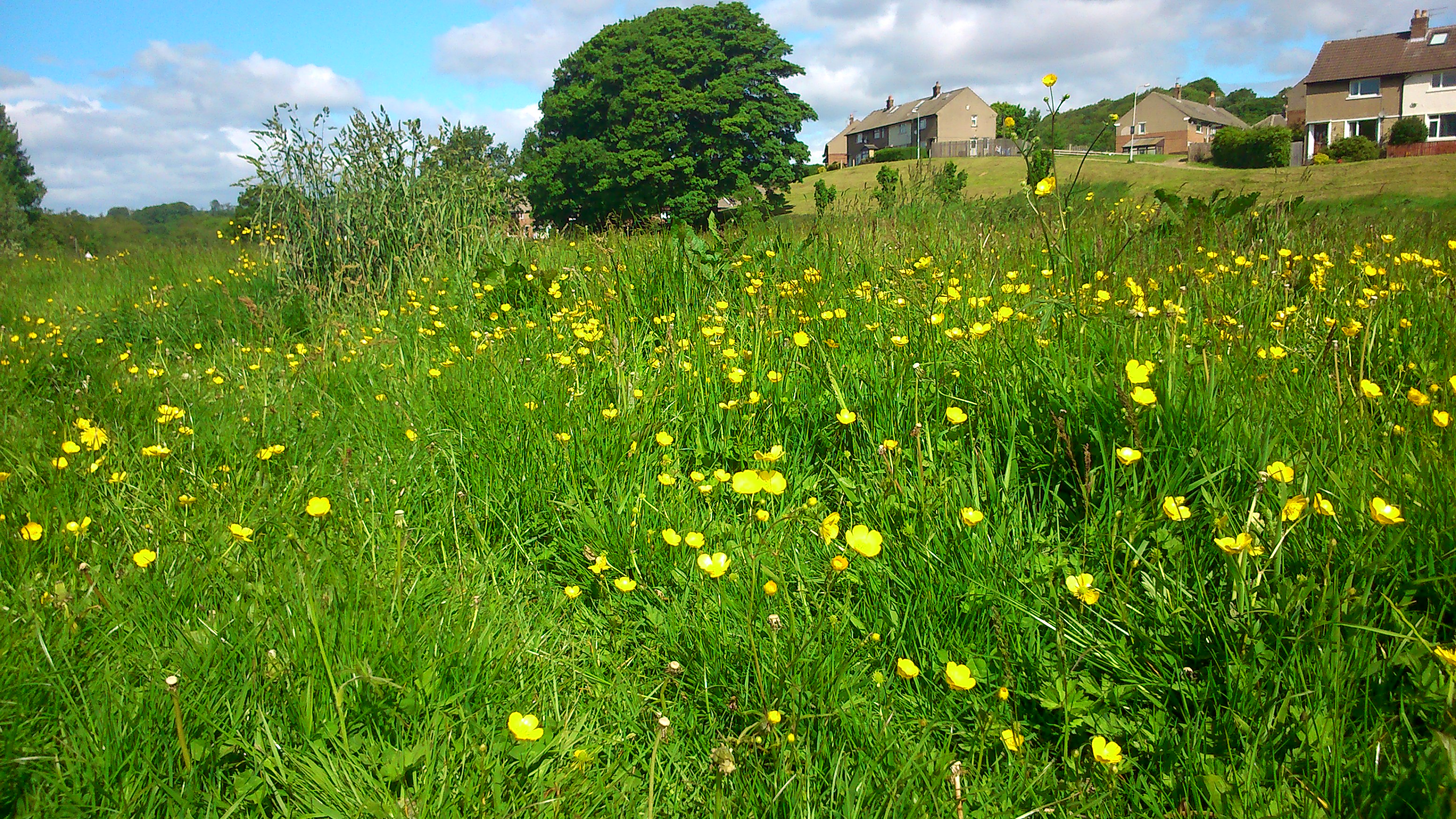 This grassy flood plain next to the river (the riverside path is where that man in blue is walking to the left) has traditionally been mowed fairly regularly by Bradford Council. But in an age of austerity, they’re letting the grass grow… The buttercups have taken the opportunity to add a sprinkling of yellow to the “monoculture” green…