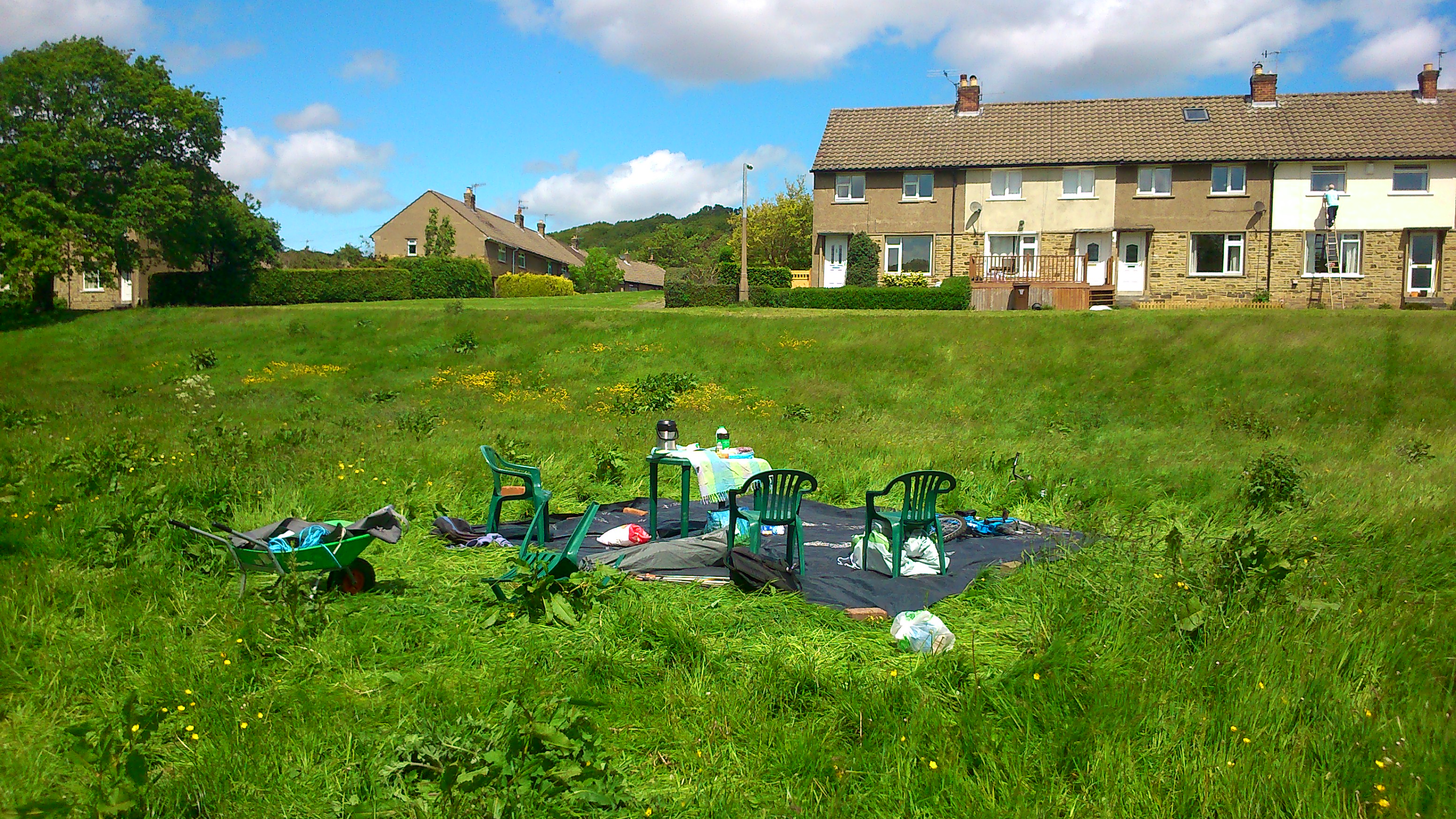 Here’s the remains of the gazebo tent we put up for shade and as a refreshment area. The wind was too strong for it so we had to take it down again… an outcome indicative of how our whole plan started to go a bit south! The Council had provided us with some “plugs” to plant amid the long grass, to provide colour… but in the event it turned out that the plugs were too small, and the grass too long, to plant in the “meadow” proper. Nor, in fact, were they the promised poppy plugs… they turned out to be begonias!