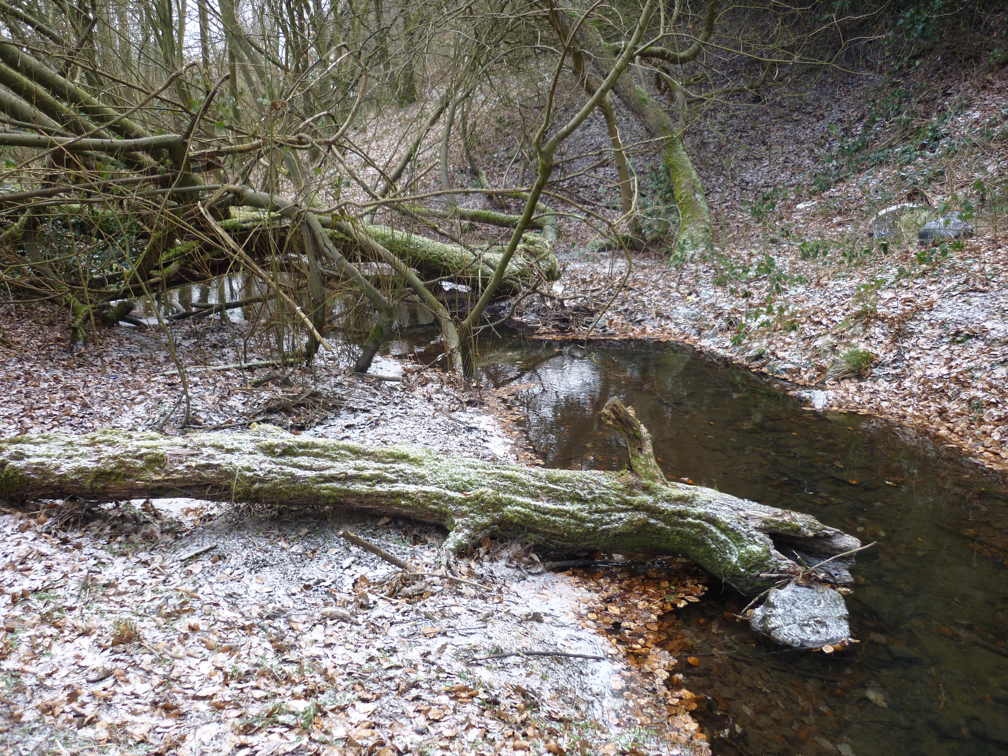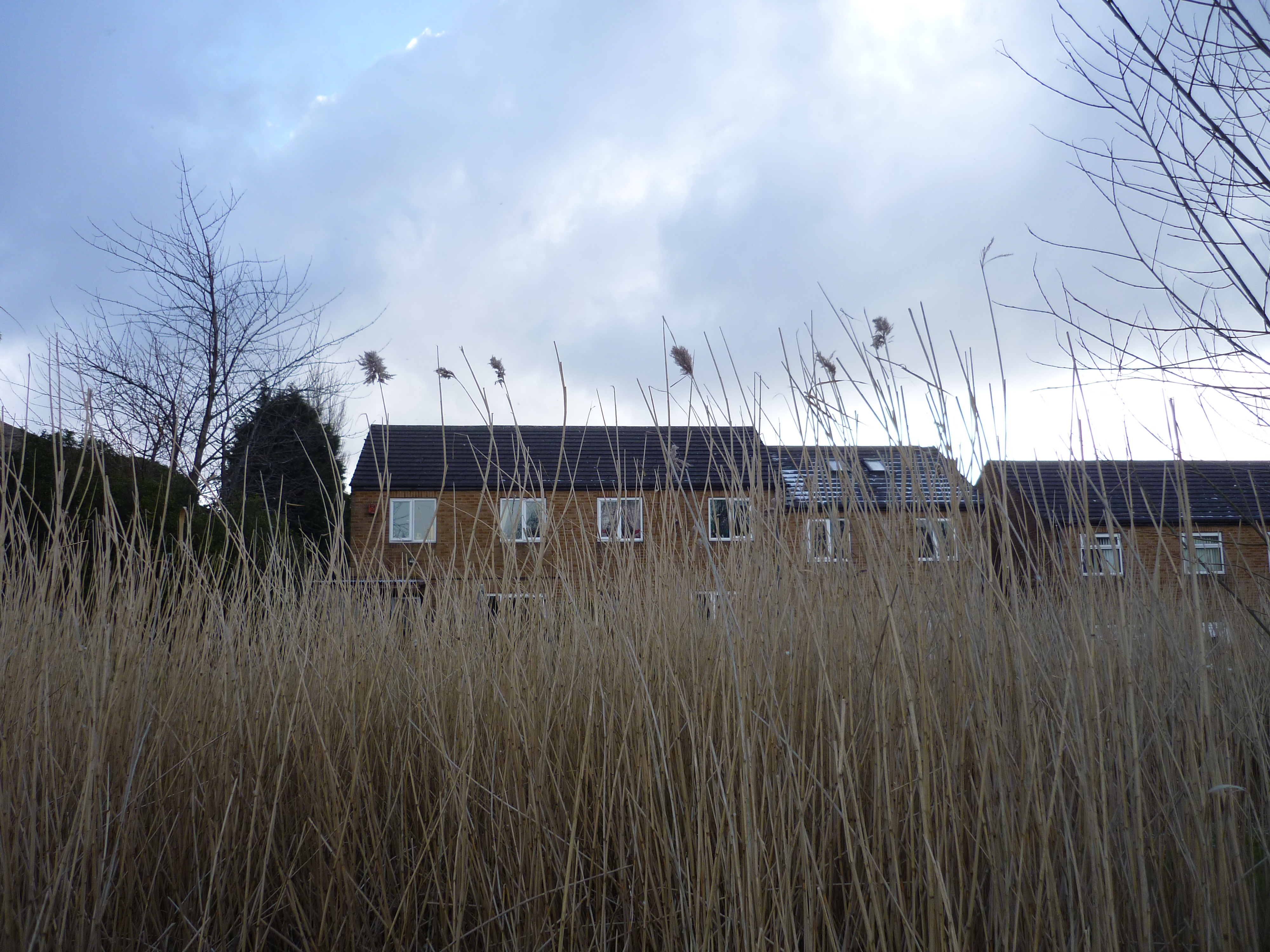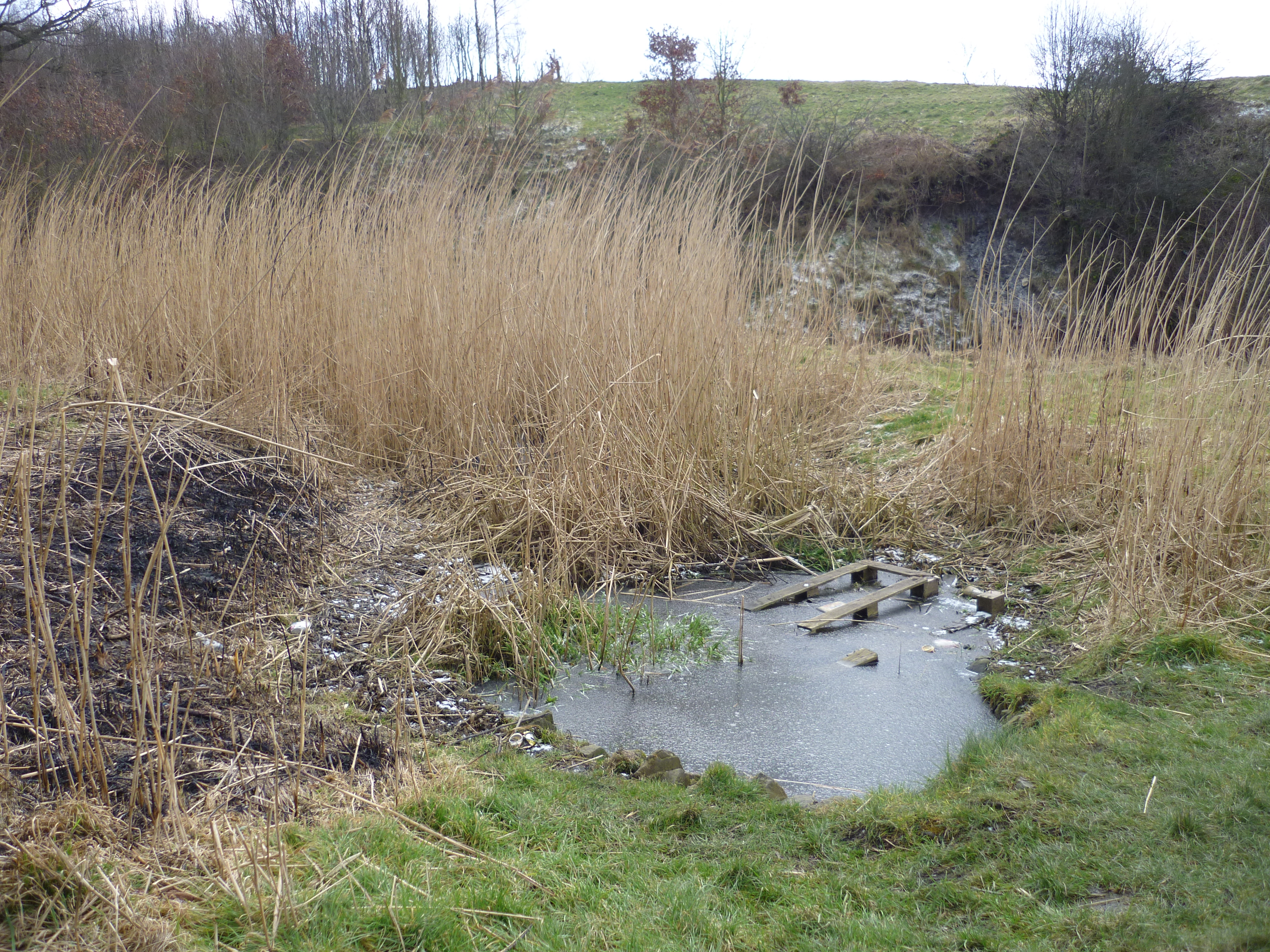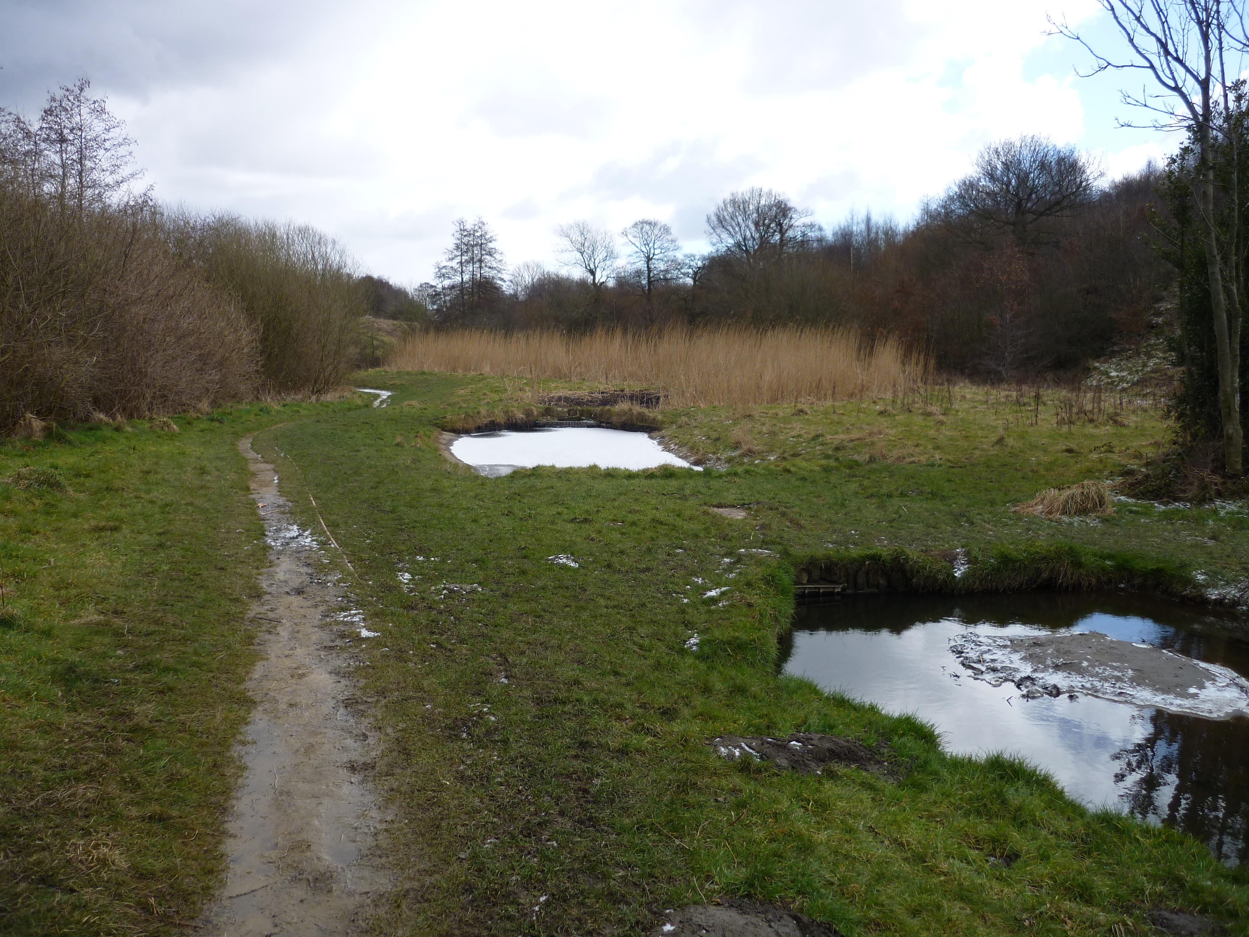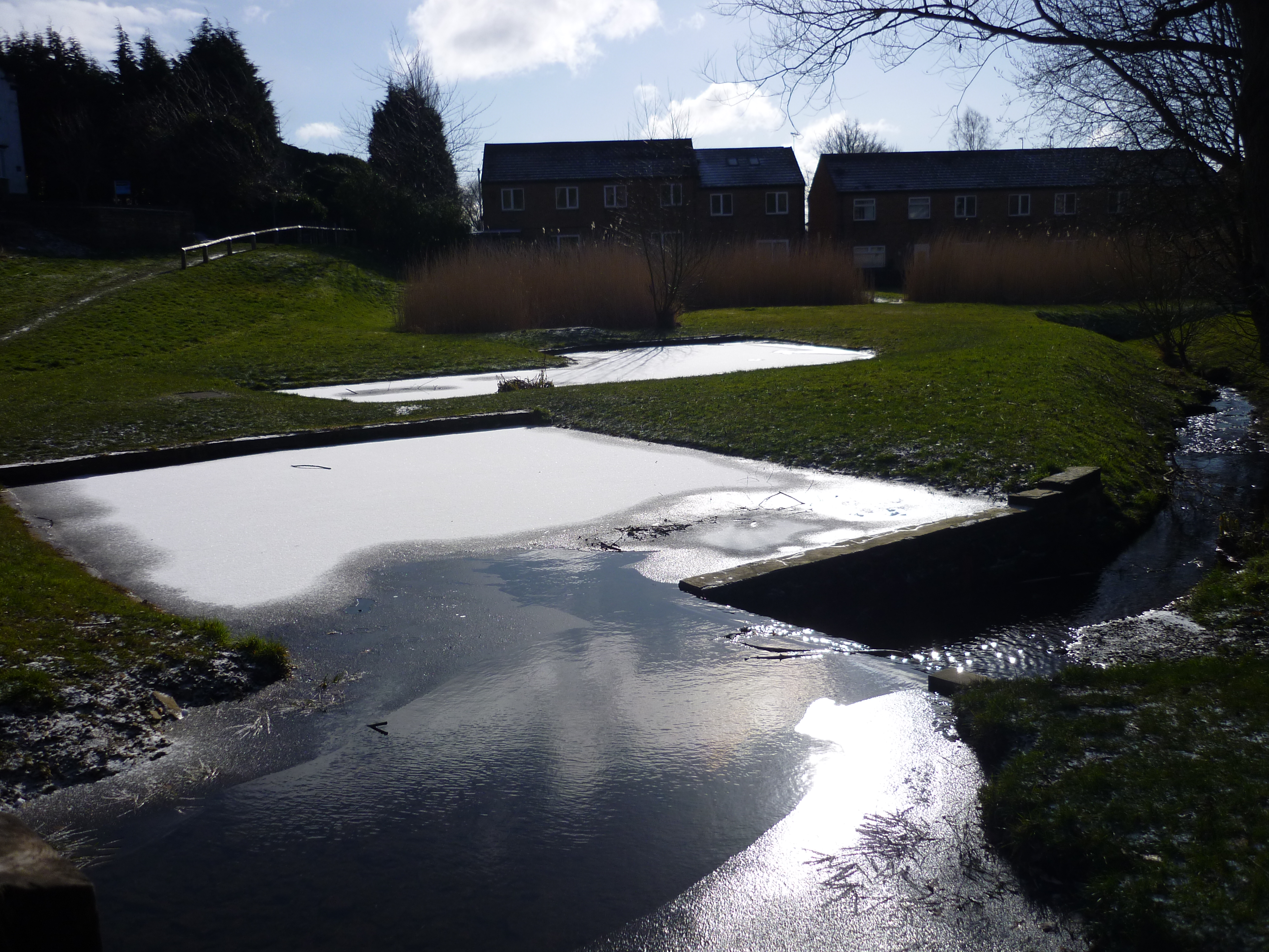 chellow pitty 041Here’s the treatment pools in the Chellow Dean wetlands (covered with some snow and ice first thing this morning), with the Beck flowing on to the right, and the reed ponds in the background… Like the whole wetland area, the landscaping is neat and appealing despite the oddly geometric ponds, and the reeds grow high in their neatly defined beds…