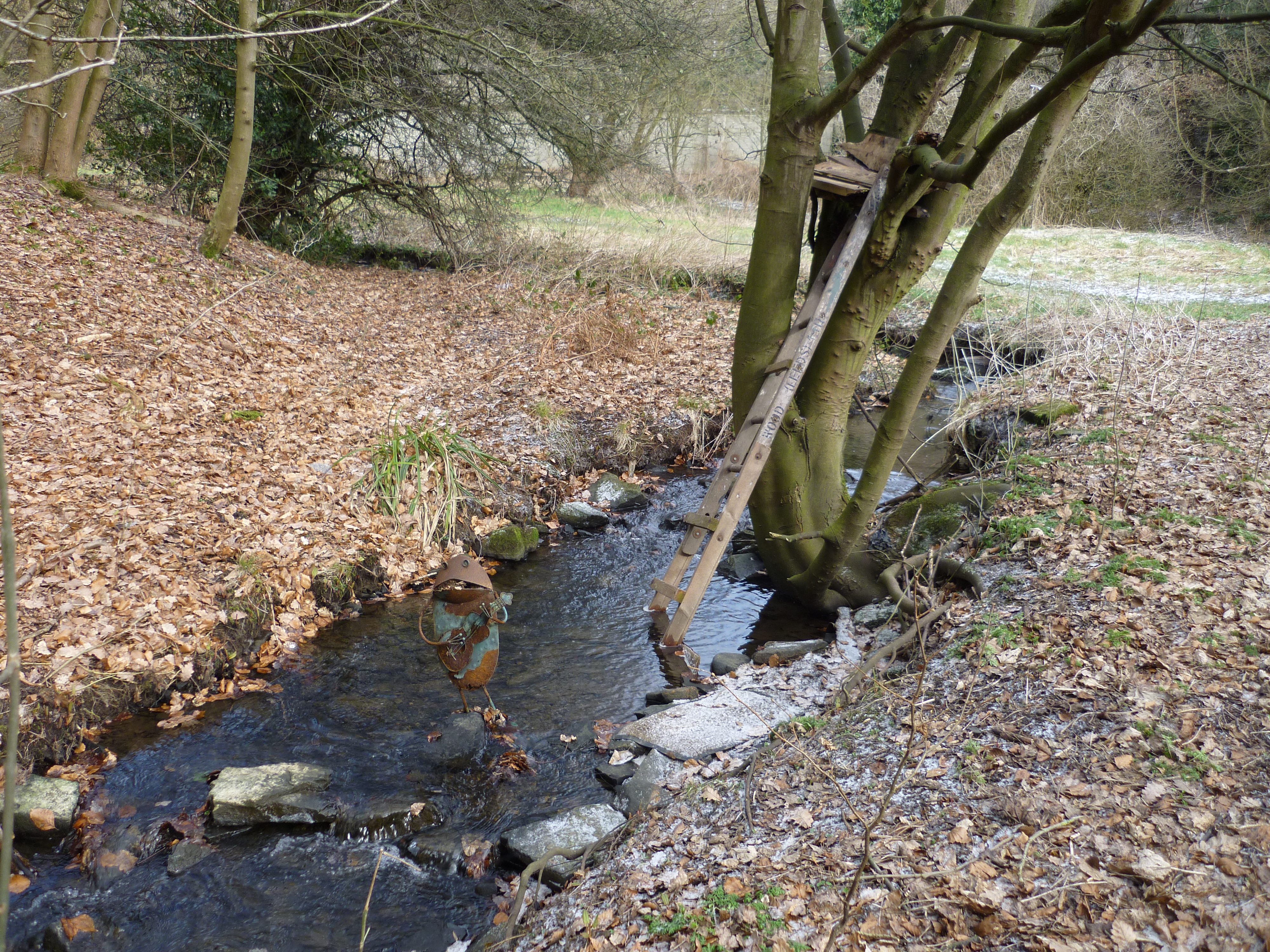 chellow pitty 049No sense of feeling unwelcome here. And there’s evidence of playful, personal interventions in the landscape – such as the little guitar-playing frog and improvised treehouse below…