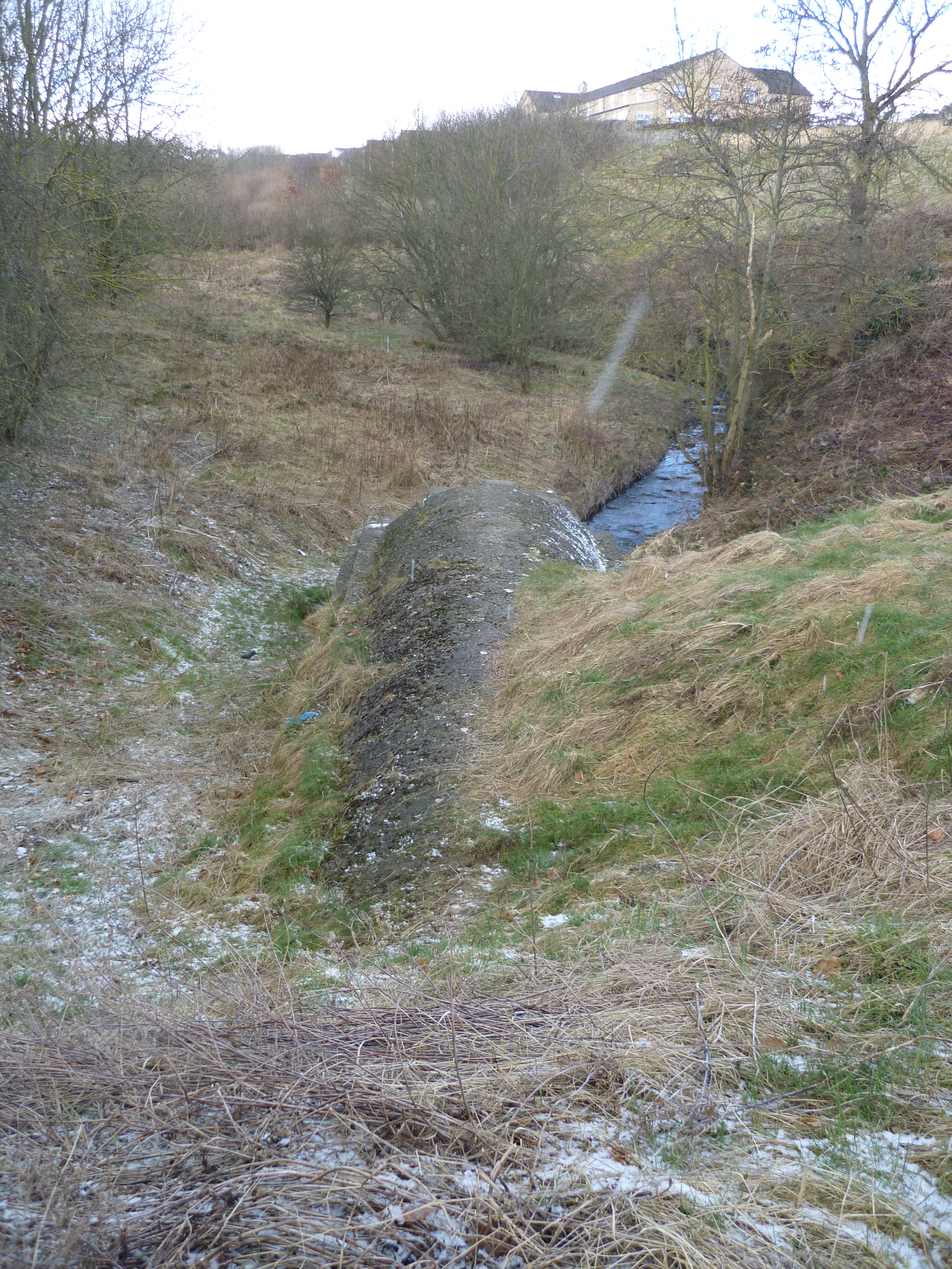 chellow pitty 109If you can’t quite make it out, that’s the word “DICKHEADS” scrawled across the map explaining the purpose of the wetland area… And in the photo below, you can see where Pitty Beck gets sucked into a huge, unsightly bit of piping that takes it underneath the main Thornton Road just to the south (the road visible on the graffiti-ed map above!).