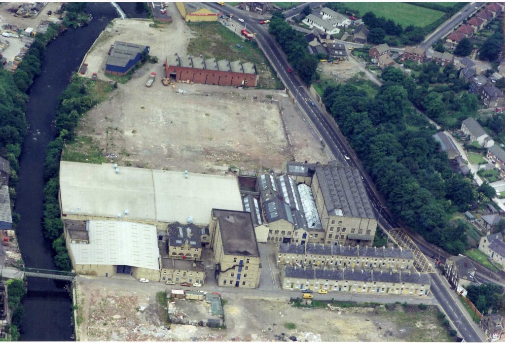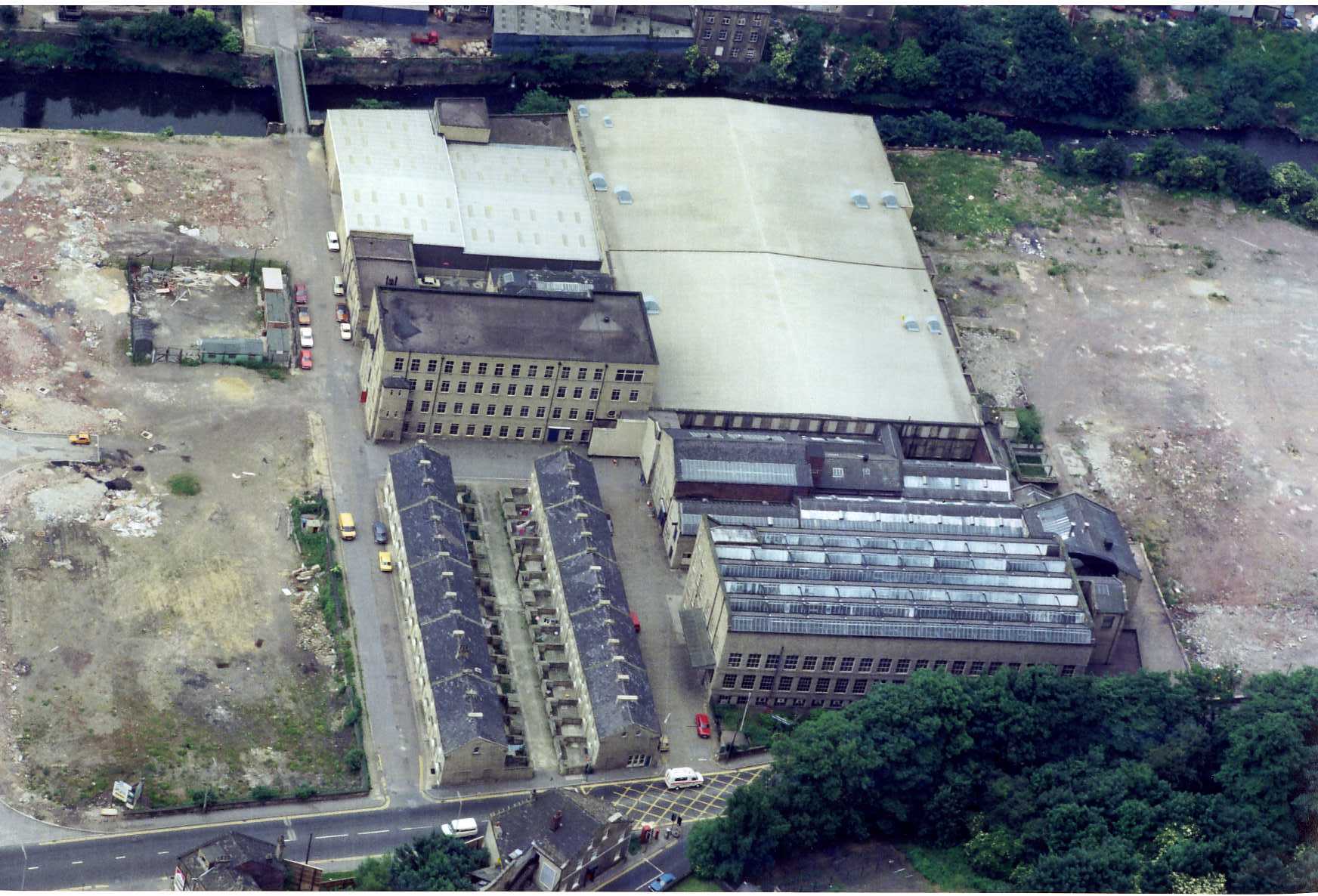 This shot – clearly more recent! – shows Lower Holme, with a rather different set of buildings, following the demolition of both Airedale Combing (the empty site at the top of the picture — now occupied by B&M and other retail outlets) and the next mill along. Note that the line of the ancient riverside path is still clearly visible, curling between the buildings at the top of the shot (it’s now thoroughly fenced in!). Note also the two facing rows of Lower Holme’s mill houses in the bottom right of the picture. They’re the only buildings still standing today, and are still occupied by residents (about fifty-fifty private ownership and Accent Housing Association). The angle below, from the same helicopter fly-past, shows the houses prominently in the bottom of the shot…
