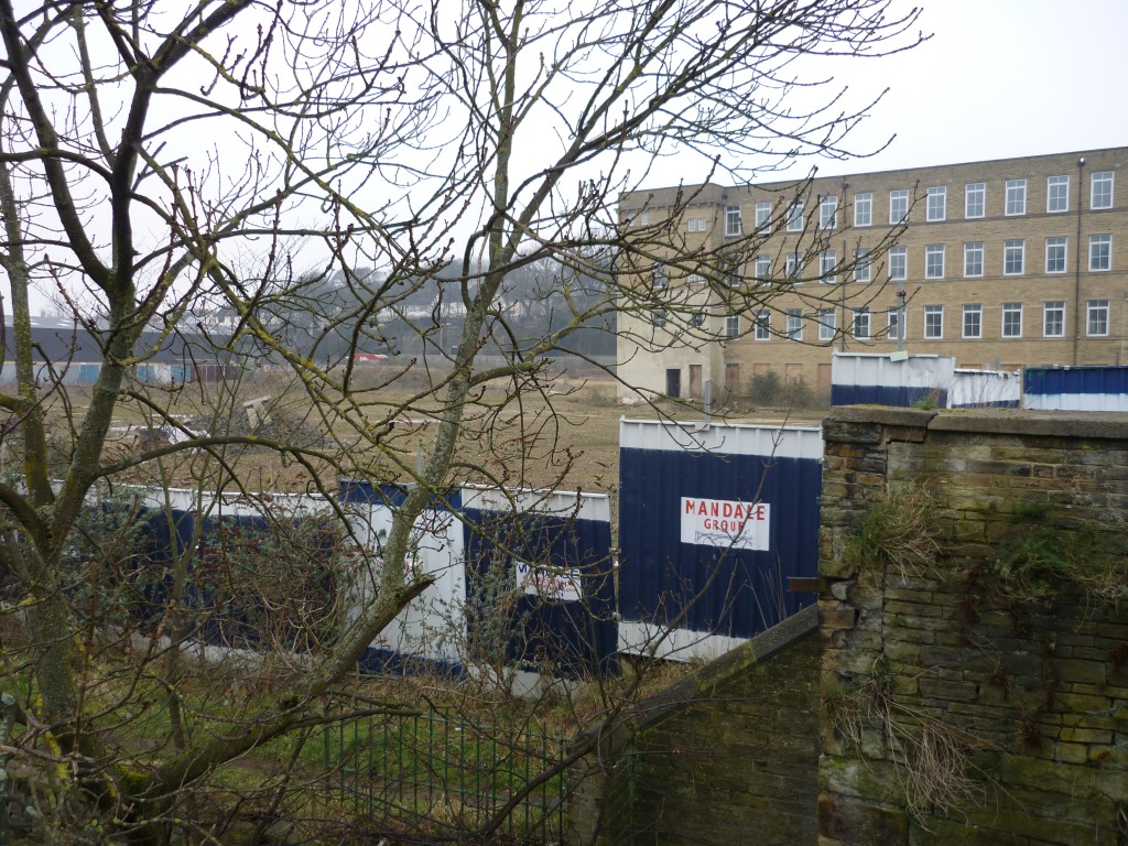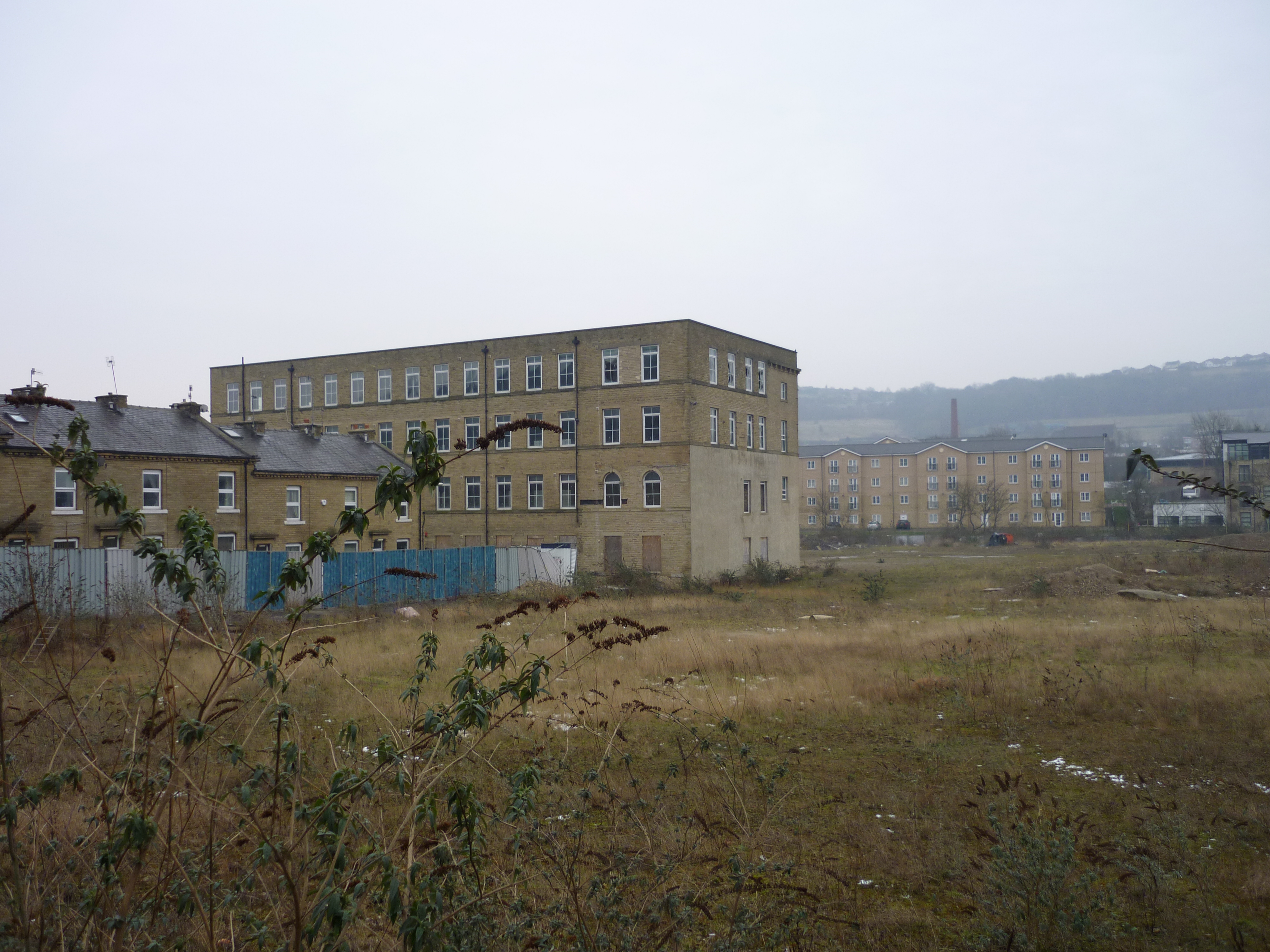 In this shot, we’re looking from the opposite angle to the first one — so that’s Airedale Combing again on the right, with the river visible above it in the picture. And next to it is the sprawling site of the (even bigger!) Lower Holme mill… The lot it occupies was owned for a period in the 19th Century by Titus Salt himself, and local historian Ian Watson believes it may have beeen the site originally intended for Salts Mill itself (his persuasive argument is outlined in his pamphlet “The Land Acquisitions of Titus Salt in Shipley and Baildon”). But Salt never developed the site, and sold it on to C.F. Taylor in 1862. To many people, the mill site is still known simply as “C.F. Taylor’s”.