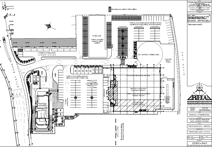 To see the picture at full size, just click on it. The eagle-eyed viewer will note that the developer named on the plans is “Mandale Commercial”: Marshalls are basically planning to move ahead with the last set of plans that Mandale had drawn up. The difference is that, where it seem Mandale was badly hit by the downturn in the property market, and could no longer borrow the money to pursue the build, Marshalls can afford to pursue the project because they don’t need to borrow. As a family firm for four generations, they have kept their assets in the company, to secure longevity (rather than stripping them out at the first opportunity). The main part of the site, then, will be occupied by a KFC – to the left of the plans, facing the main road – and a Wickes DIY store, to the right, next to the river. There’s also quite a bit of car parking space, and the old mill building is designated for “offices” (though James tells me it may end up as social housing).