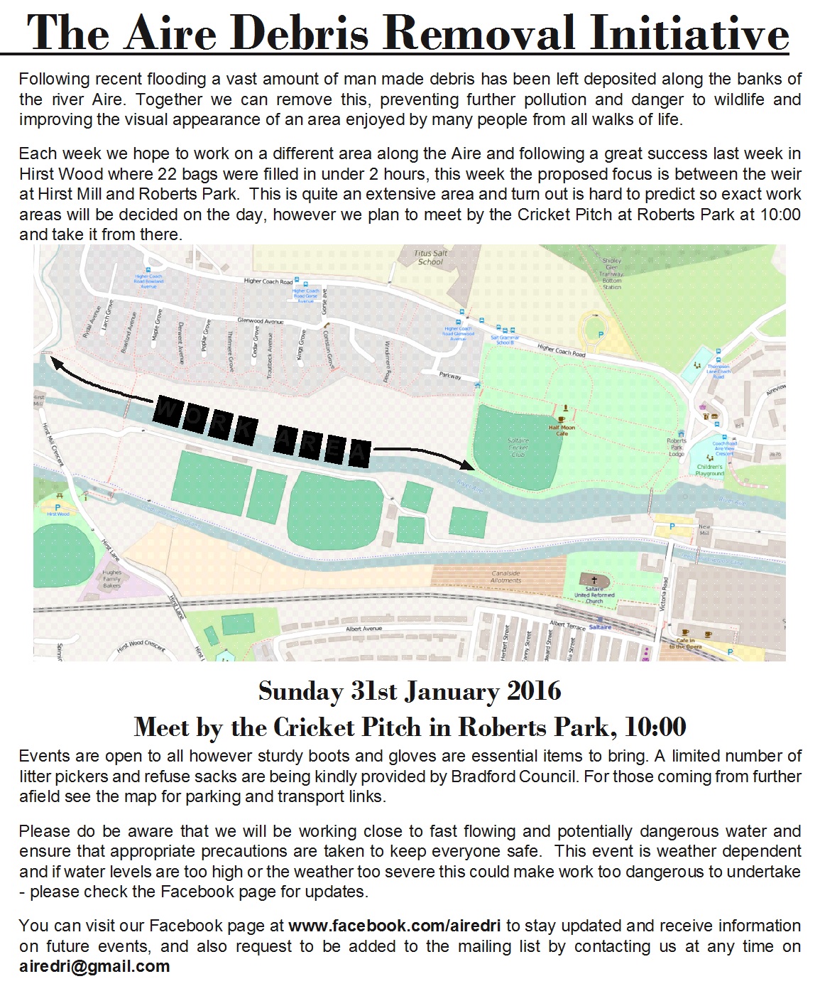 So part 1 of this blog entry (posted yesterday) was mainly concerned with the area just upstream of Baildon Bridge. This one moves further upstream to the Higher Coach Road area — where tomorrow, Sunday 31st January, weather permitting, the “Aire Debris Removal Initiative” will be leading a clean-up along the riverbank…