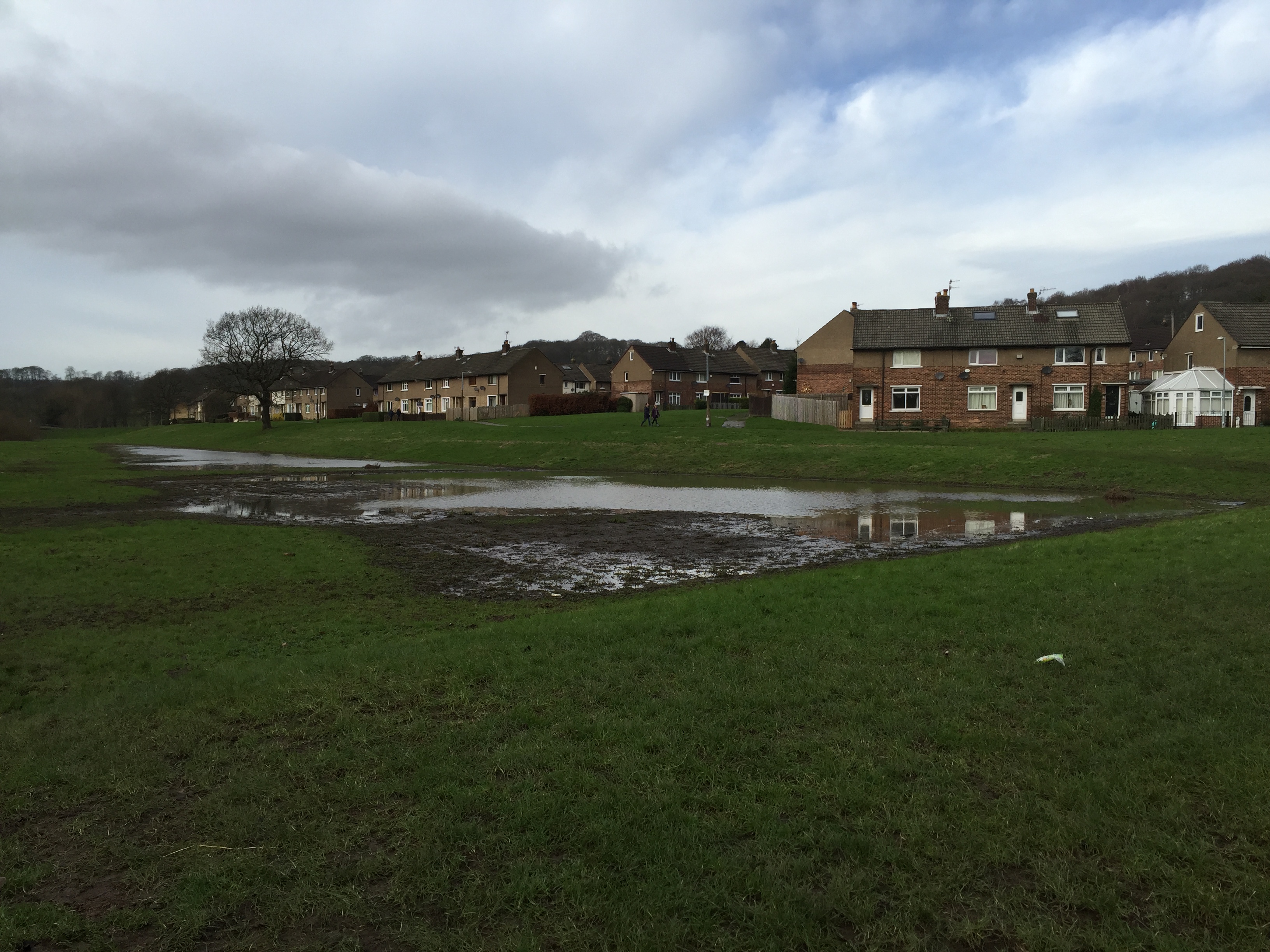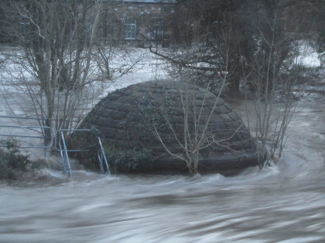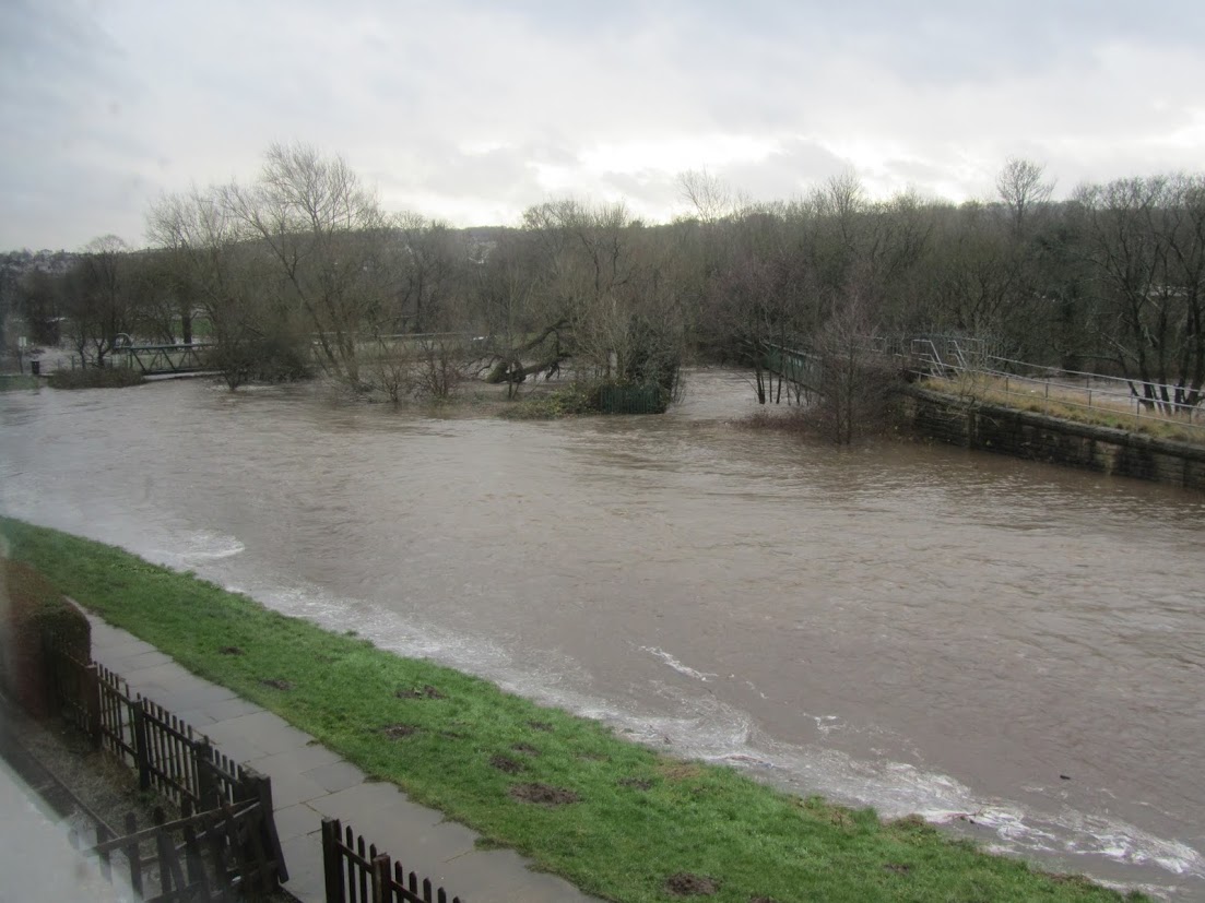 Thankfully, though, the residents of the HCR estate remain pretty confident that they won’t be directly affected in their homes, at least. On Boxing Day, just as during the last major floods of October 2000, the water came up almost as far as the fronts of people’s houses on Bowland Avenue — at the furthest, westerly end of the estate — but did not actually make it to their front doors. And since these houses were built, quite deliberately, with no basements, there is no damage there either. As Ruth Bartlett, who lives in one of the houses on Bowland, remarks: “I’m really very grateful to the people who built these houses [in the 1950s], because they knew what they were doing. The water stays where it’s meant to — on the field.” This was the view from Ruth’s bedroom window at 1.45pm on Boxing Day, when the water level was still rising…(with many thanks to her for sharing)