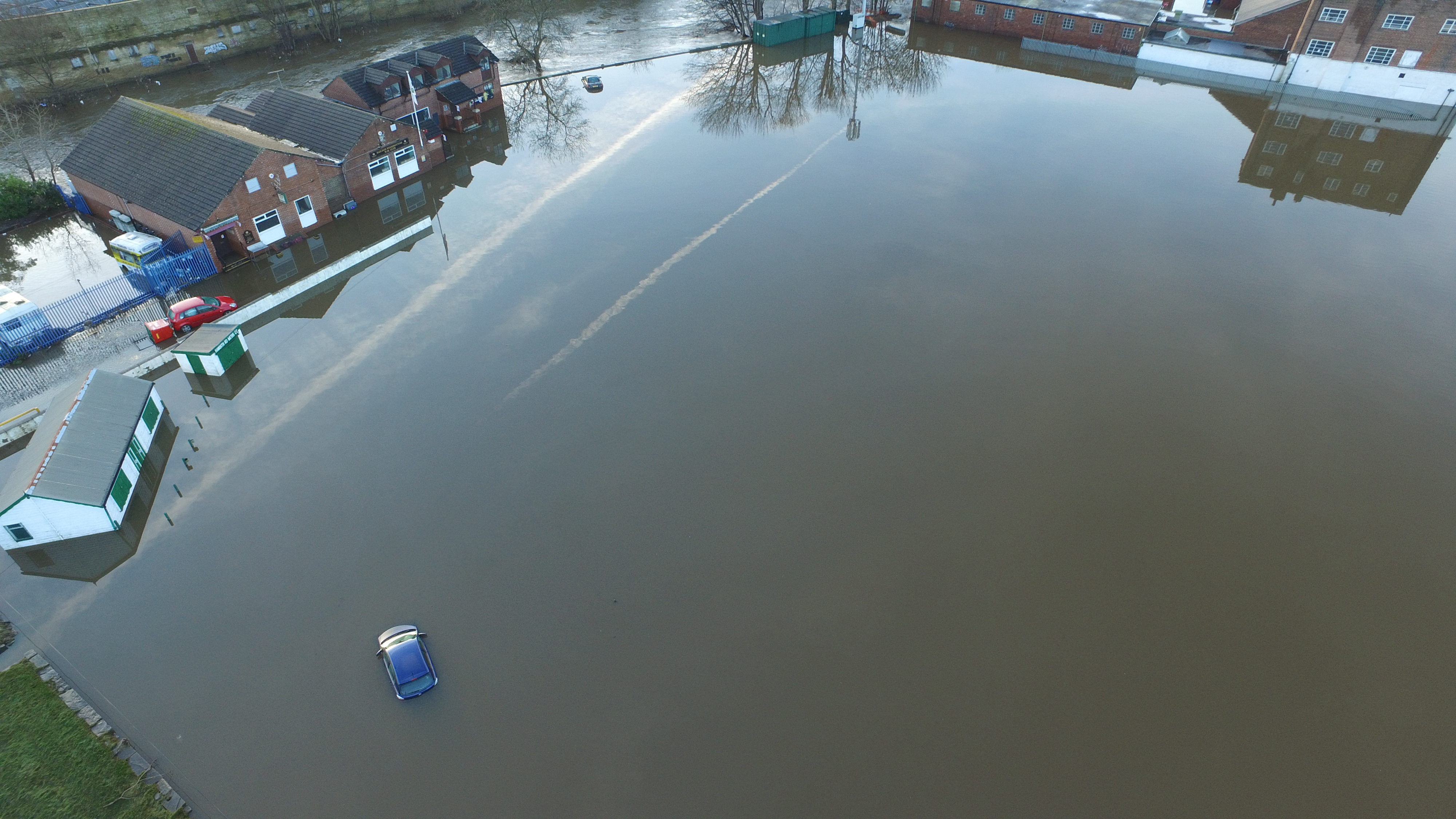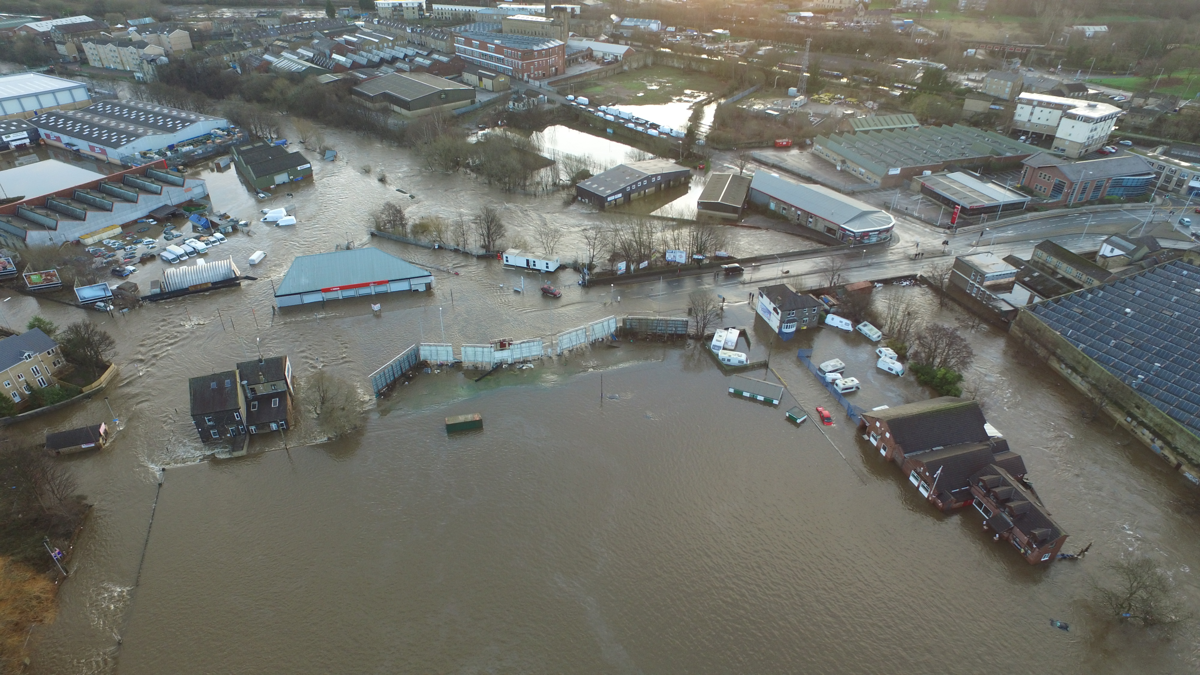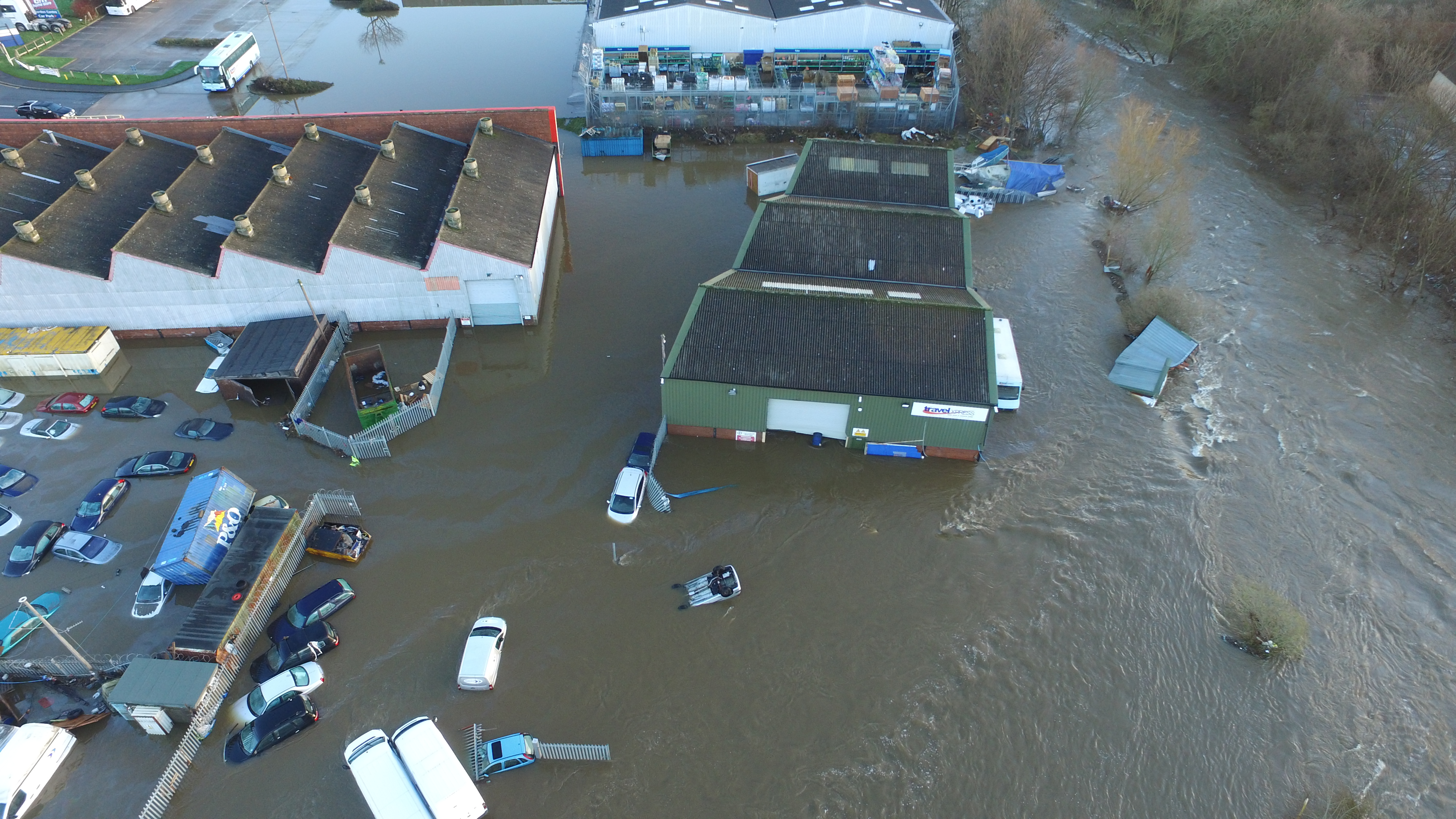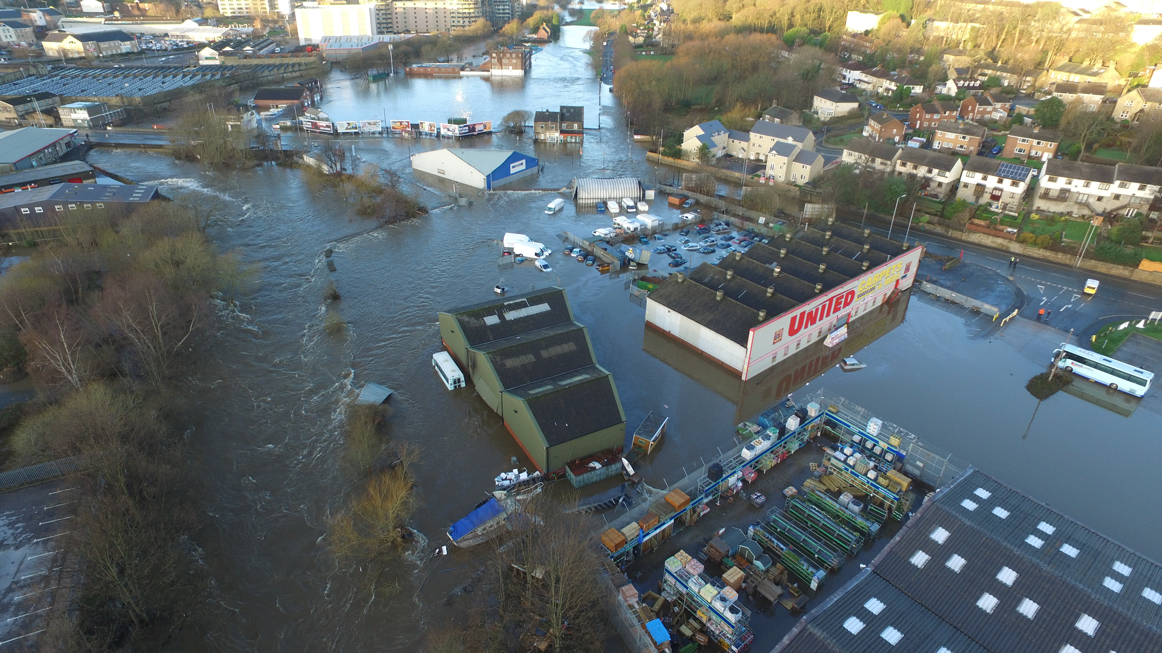 Above, we see the view from just downstream of Baildon Bridge, looking west. The cricket pitch etc are to the back of the shot now, and in the foreground we see the retail area east of the bridge, off Otley Road… United Carpets, and in the bottom right, the garden centre section of B&M. The river channel proper is to the left. The collection of white vans in the middle of the shot is part of the Northway Vehicles fleet — the part that hadn’t been swept away by the flood — and you can see here just why Northway’s compound was in exactly the worst place as far as the flood was concerned… right in harm’s way as the water diverted across the cricket pitch tries to find its way back into the main channel. Below we see the same scene in reverse (i.e. the other side of United Carpets is now to the left; the river is to the right), and here you can get a very clear sense of the trajectory that would have been taken by the 37 vehicles swept downstream off the Northway lot…